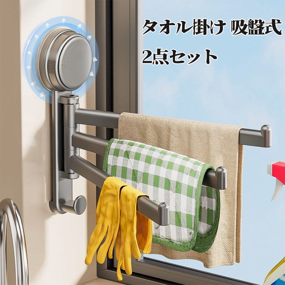 タオル掛け 吸盤式 金属 浴室 タオルホルダー 2点セット キッチン タオルラック グレイ タオルバー キッチン 洗面所 バスルーム 収納 壁付け