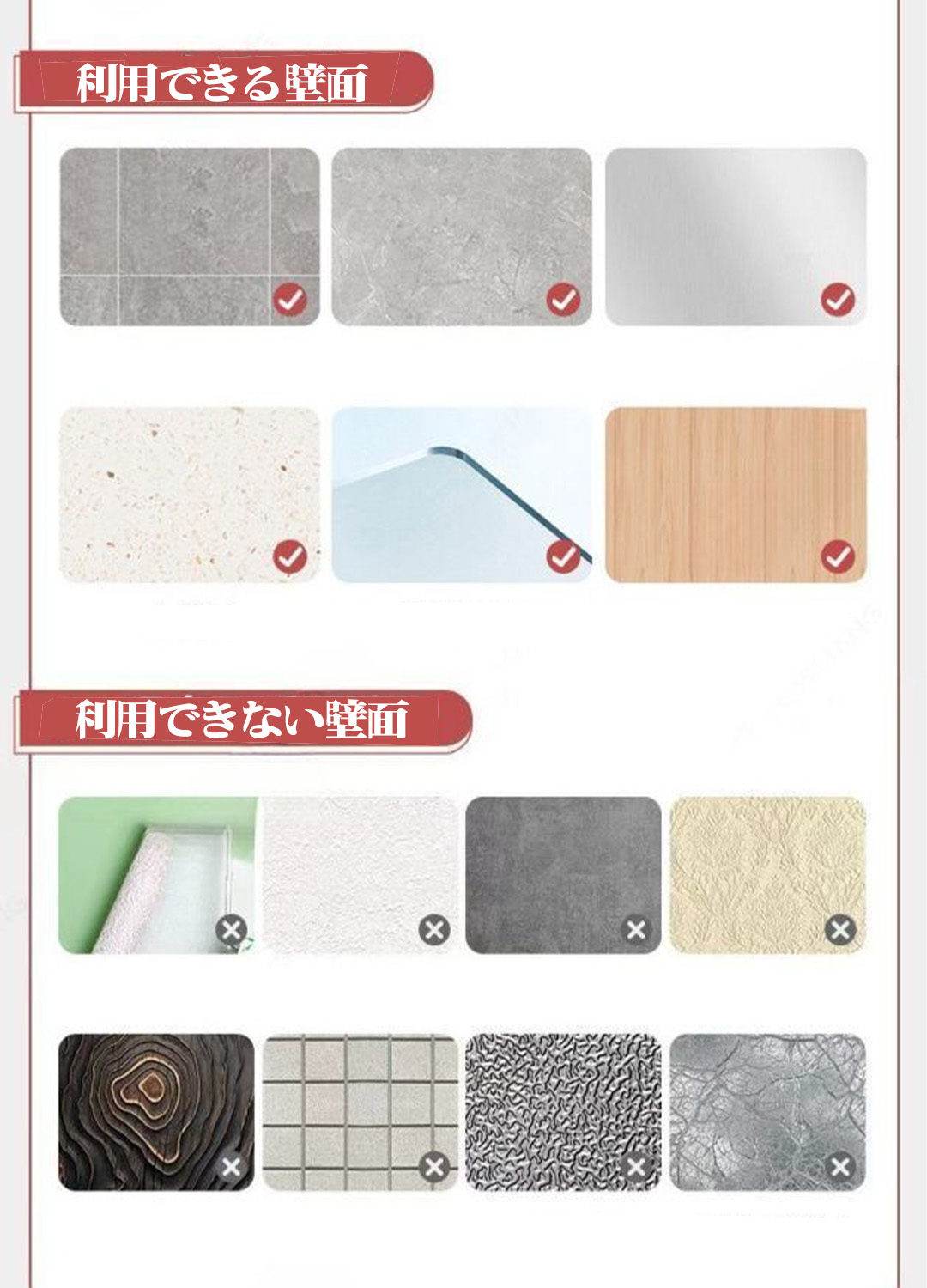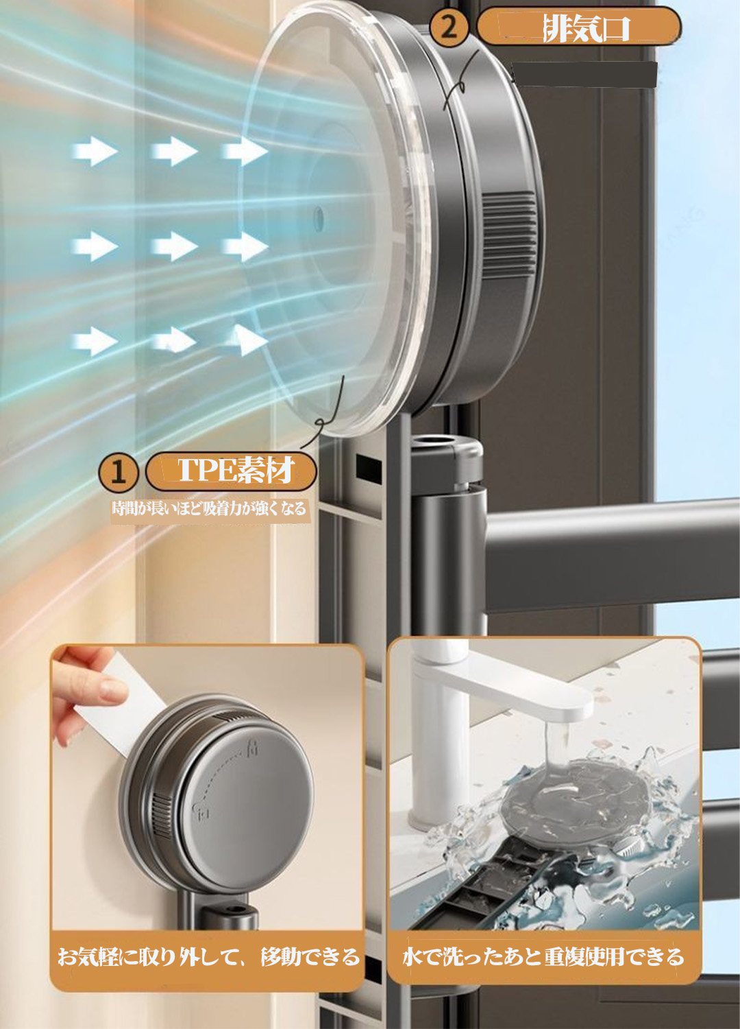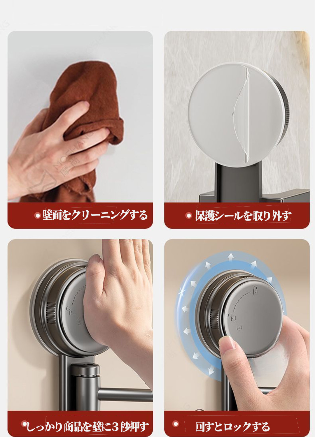 【取り付けが簡単】工具やネジを使わずに壁に穴を開ける必要なく、強力粘着吸盤で壁に貼り付けて壁を傷つけません。強力な粘着吸盤なので、落ちる心配がありません。(ご注意:タイル、ガラス、木製の壁、金属など、ほとんどのツルツルな壁に対応できますが、粗すぎる表面には適用していません。)