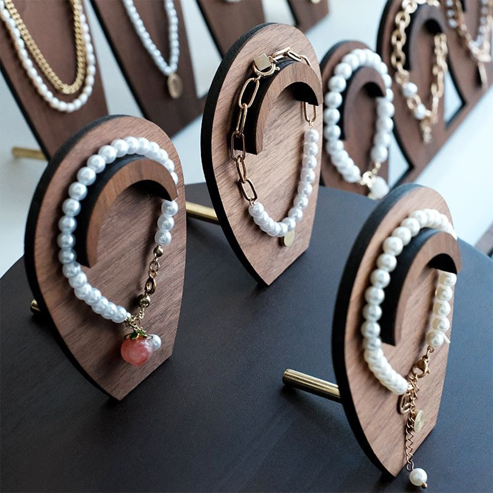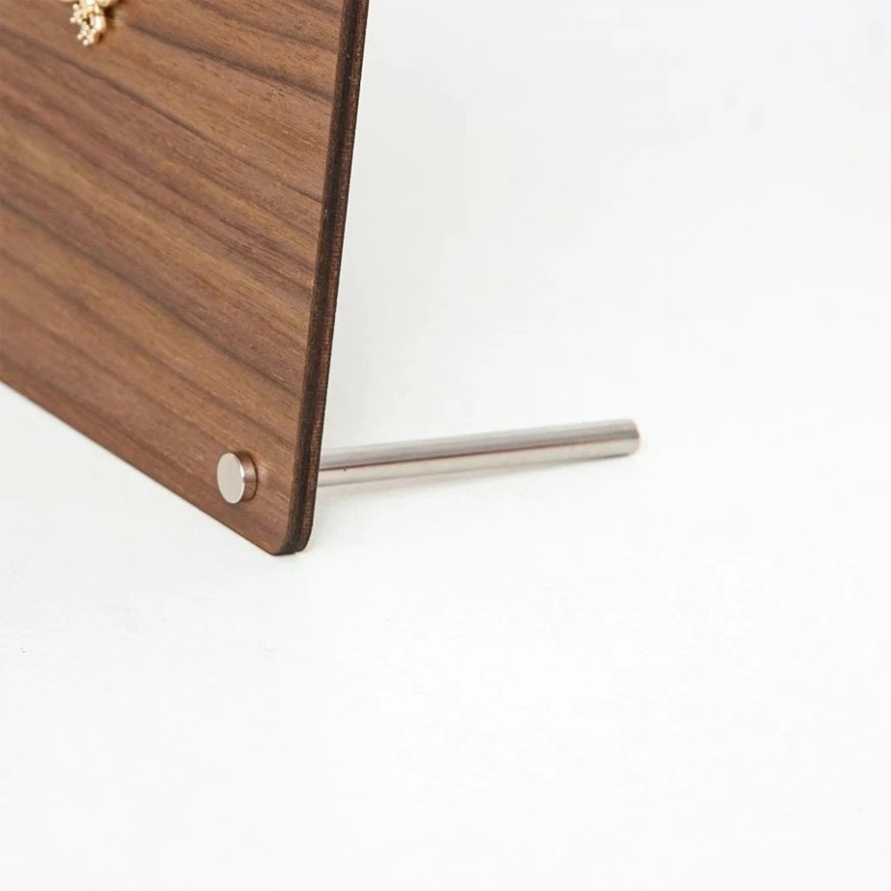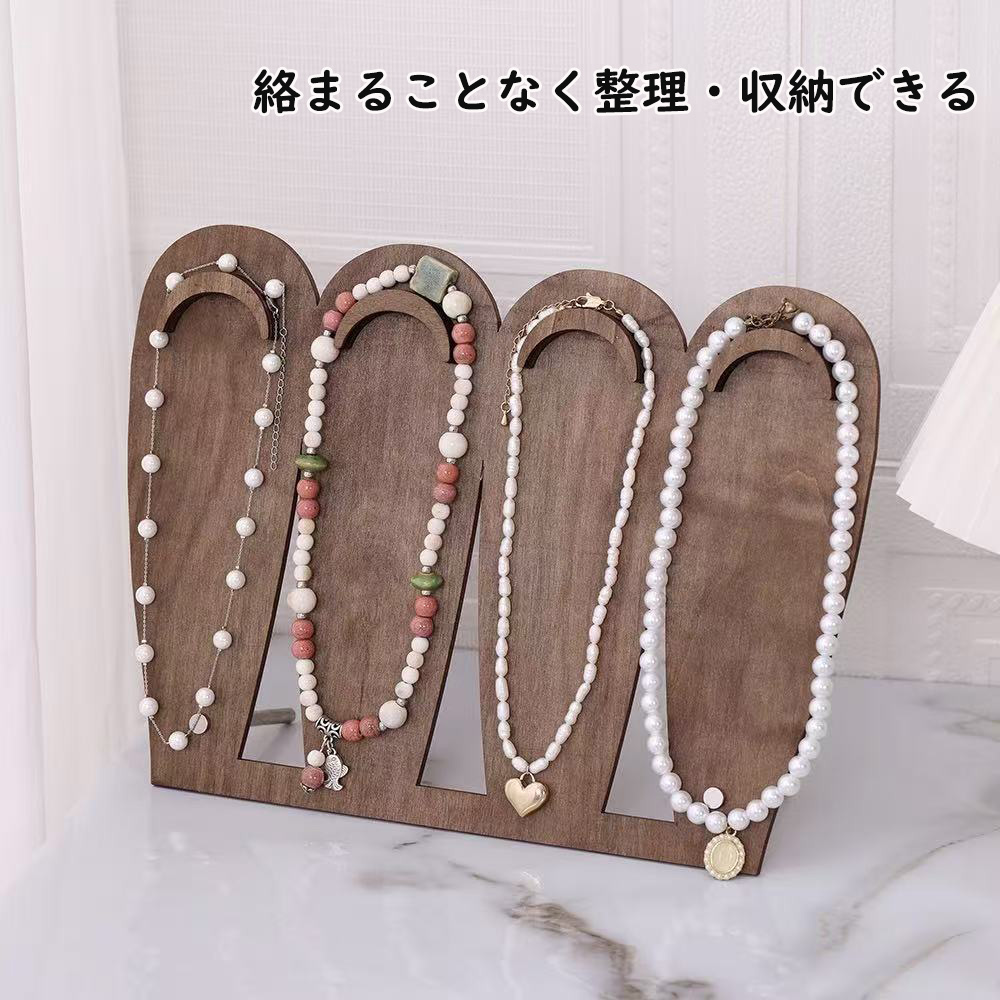 「見せる収納」スタンドにフックを装着しており、ネックレスやブレスレットを直接吊り下げて陳列でき、商品の全体像を顧客に明確に見せることができます。厚みのある木製ベースと堅牢なフレーム構造で、テーブルの上に安定して立てることができます