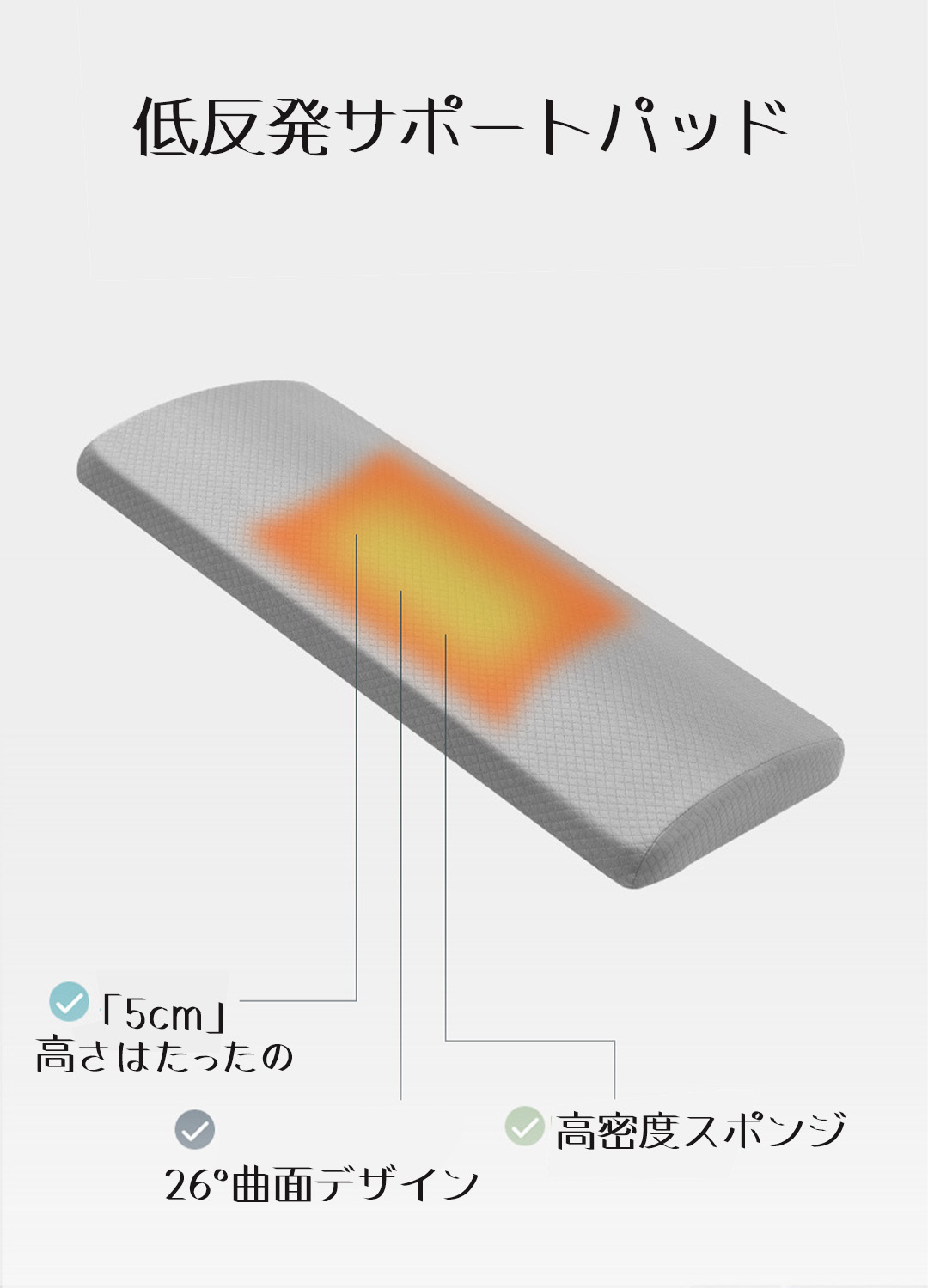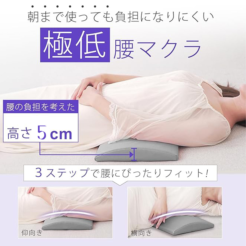 長時間使用しても腰が痛くなりにくい、厚さ5cmの低腰マクラです。これまでの腰枕が体に合わなかった方も、心地よく眠れるよう設計されています。