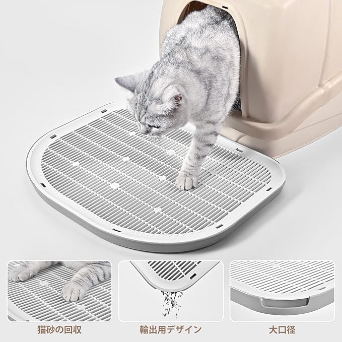 大口径の形状で、密閉型・開放型など様々なタイプの猫砂盆と組み合わせられます。猫砂回収構造が搭載されているため、落ちた猫砂はマット内部に留まり、後から一括して処理することが可能で、掃除の手間が大幅に減ります。