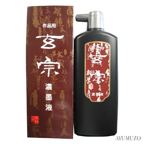 墨色と特徴:紫紺系の純黒。「鉱物性直火焚松煙」「合成糊剤使用」作品用『玄宗』は固形墨のもつ条件、書き味、のび、紙への浸透性・表具性をすべて兼ね備えた液体墨。鉱物性直火焚煙の紫紺系の色調は黒味の強さを表現。低温下でも粘度変化が少なく、年間を通して安定した流動性を保つ。漢字・調和体の練習・作品作りに適しています。