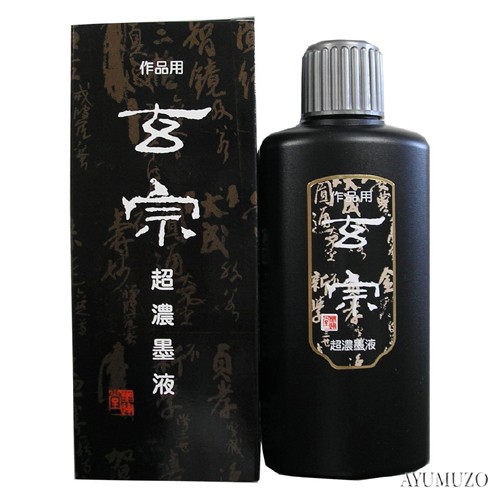 墨色と特徴:紫紺系の純黒。「鉱物性直火焚松煙」「合成糊剤使用」作品用『玄宗』は固形墨のもつ条件、書き味、のび、紙への浸透性・表具性をすべて兼ね備えた液体墨。鉱物性直火焚煙の紫紺系の色調は黒味の強さを表現。低温下でも粘度変化が少なく、年間を通して安定した流動性を保つ。漢字・調和体の練習・作品作りに適しています。
