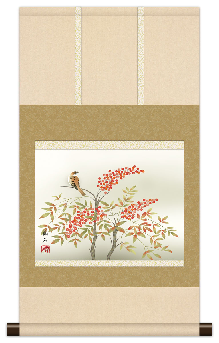 10年保証 掛け軸 ミニ掛け軸 和風 花鳥画 冬掛け 南天に雀 高見蘭石 モダン 掛軸 床の間 和室 おしゃれ 壁掛け 絵