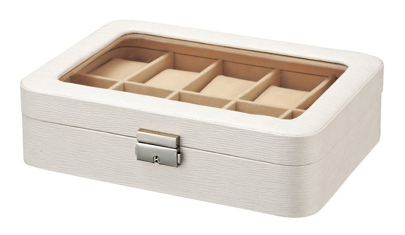 腕時計を収納できるコレクションボックスです。さりげなくラメの入ったレザーを使い他にはない高級感ある仕上がり。上部には中が一目で分かるよう透明なガラスを入れて使いやすさにもこだわりました。腕時計を美しく収納できるウォッチボックスと、ウォッチボックスにアクセサリーも収納できる充実機能のウォッチ&ジュエルボックス。
