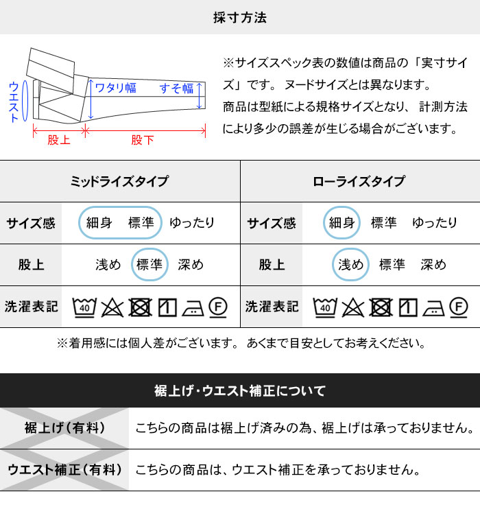 | ウエスト:73cm 76cm 79cm 82cm 85cm 88cm 91cm 94cm 97cm ミッドライズ/股下:71cm・74cm・77cm ローライズ/股下:70cm・73cm・76cm |