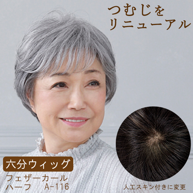 このウィッグは地毛をいかし、頭頂部をすっぽりおおって広範囲をカバーする六分ウィッグ(部分ウィッグ)となります。