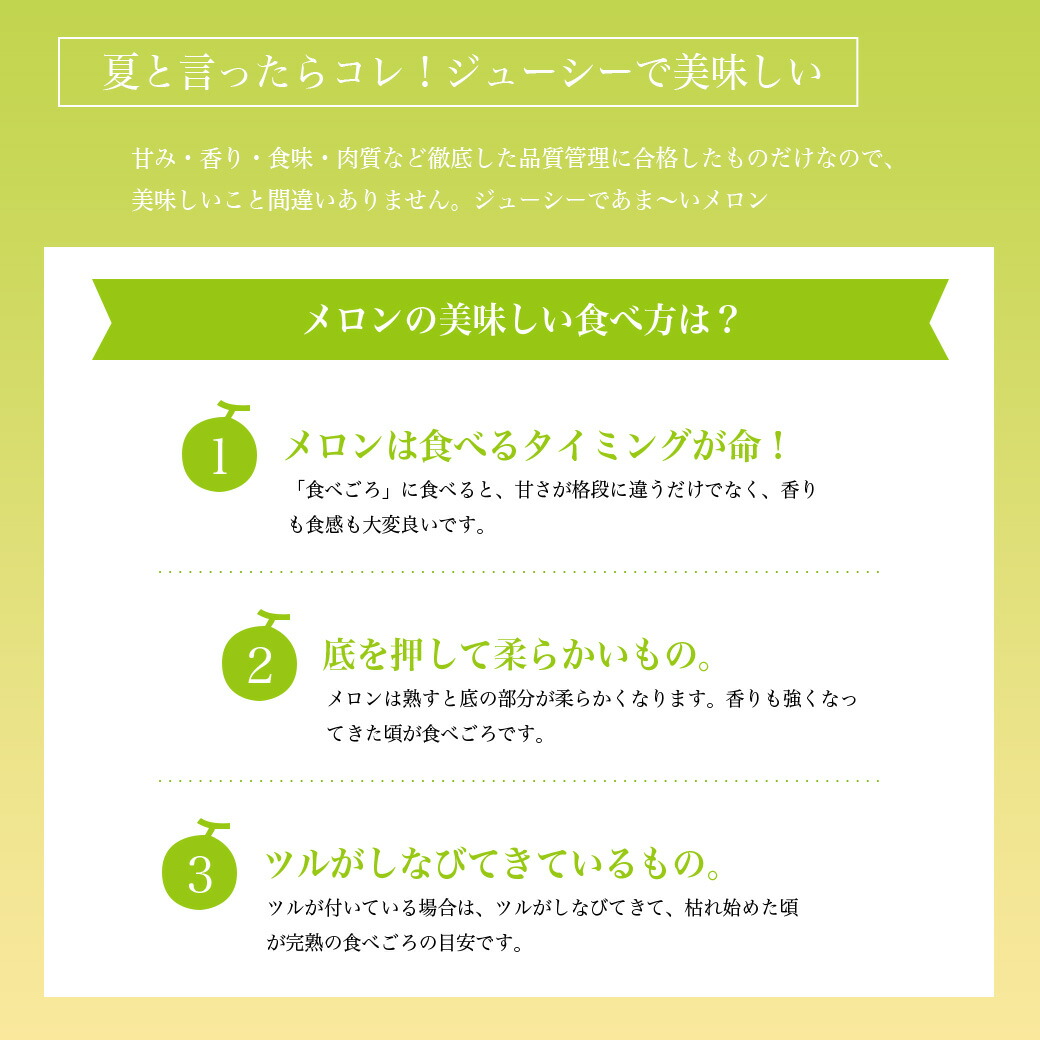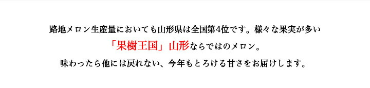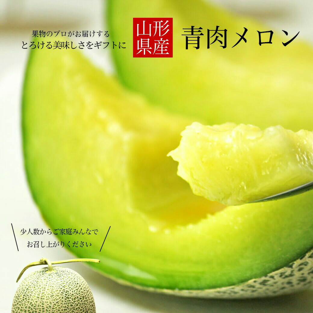 | 夏のフルーツ庄内からお届けいたします 山形県庄内産の青肉メロン。糖度が高いと言われる「浜王」メロンを4.5kg以上の大ボリュームでお届けします。 日本でも有数のメロン産地である山形県庄内地区の庄内メロンは砂地で栽培されています。周りの山々からの雪解け水が砂丘の地下に流れ込むため、豊富な地下水を使って水を与えています。砂地は水はけがよく、メロン自身が成長に必要な水分だけを吸うことができます。 また、砂地は熱しやすく、冷めやすいため、昼夜の寒暖差が大きく、甘いメロンに育つのです。 メロン好きにはたまらない! お中元などの夏のギフトにピッタリです! |