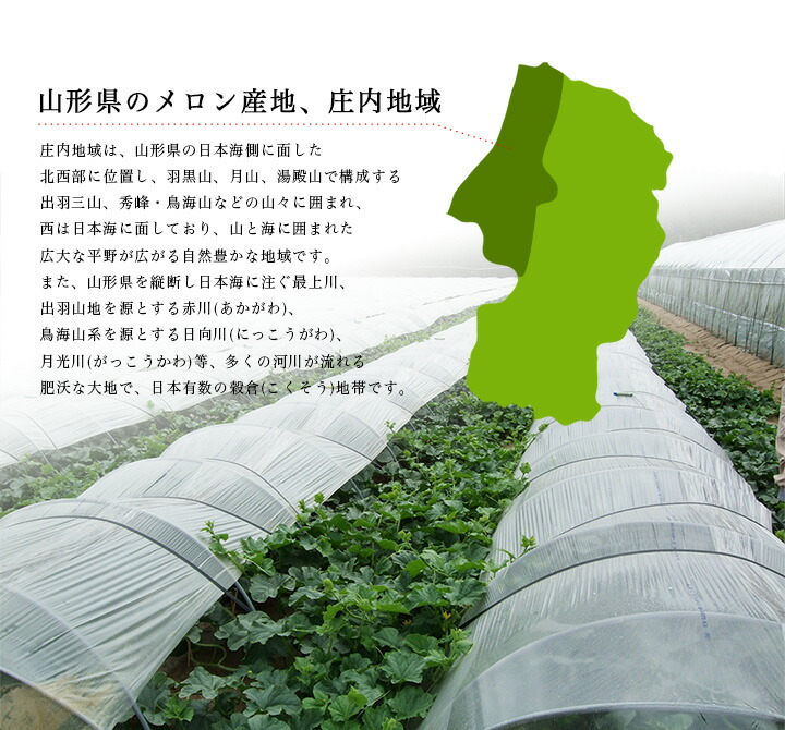 美味しいメロンの栽培に必要なのは、水はけが良い土地。土壌に水分が多いと、メロンが吸収し、糖度が下がってしまいます。鶴岡市から酒田市にかけて続く庄内砂丘は、水はけが良く、メロンにとっては絶好の土地です。また地下水も豊富で、栽培にとっても間違いない環境です。夏の日差しと温度、夜の涼しさの寒暖差は、ネットの張りを良くし、甘みを強くします。これらが名産地としての高い評価を得ています。