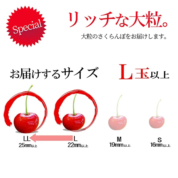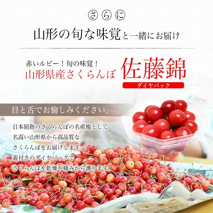 発送方法:常温便orクール便で発送致します。中国 四国 九州へは場合によって航空便を利用させて頂きます。さくらんぼ以外、同梱は出来ません。