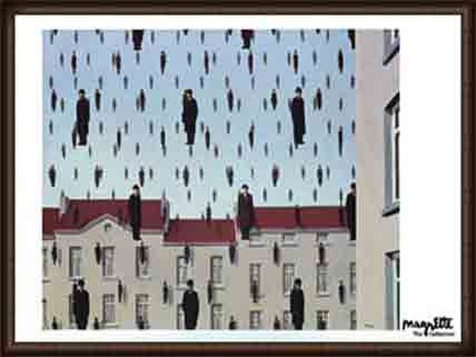 | ■商品説明 | ルネ マグリット ベルギー【1898-1967】空の描写、特に青空に多大な愛着と確かな技術で挑んできたマグリット。「青空の芸術家」の異名を持つ彼の、有名な作品の一つが、この「ゴルコンダ」です。 本来地面と空の境界線とはどこでしょうか?当然地面から上すべての空間はある意味空といえます、しかしマグリットは、本来自由の象徴である空というものをあえて息苦しく描いています。現実世界を生きるうえで、明るい空の描写で自らの特異性をひた隠してきたマグリットは、世界中の人々にそのくくりが存在するように感じていたのでしょうか。 |