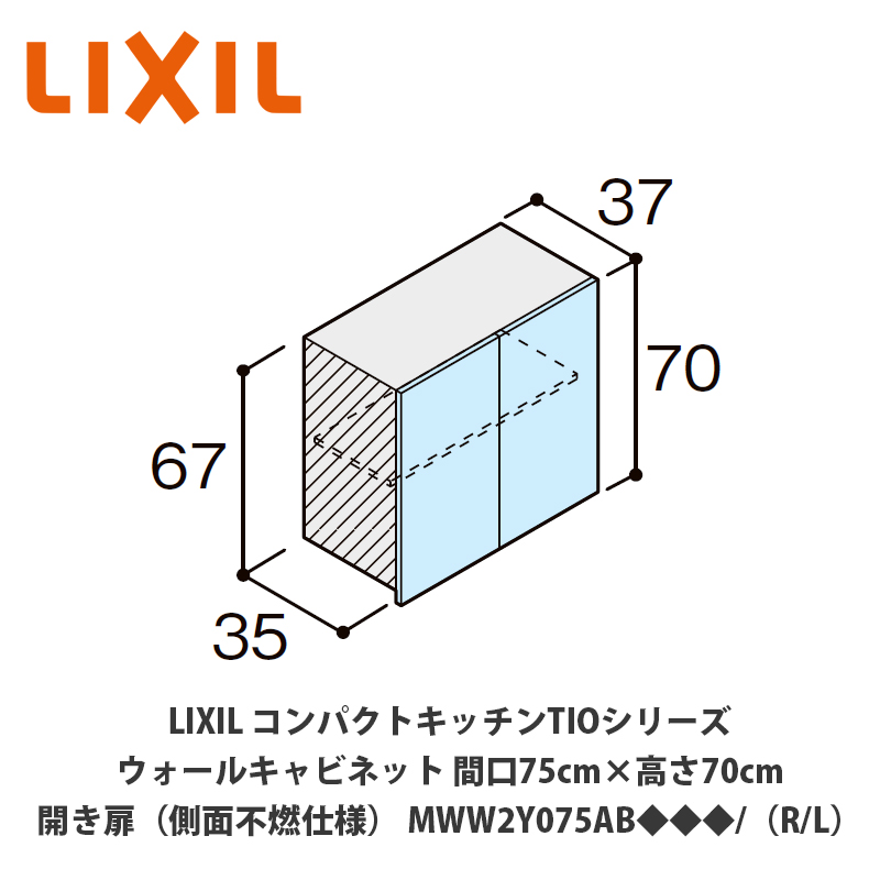 送料無料でお届け!LIXIL【コンパクトキッチンTIOシリーズ ウォールキャビネット(吊戸棚)側面不燃仕様 間口75cm×高さ70cm MWW2Y075AB◆◆◆/(R/L)】