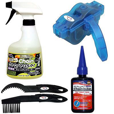 自転車チェーンの洗浄に便利なチェーン洗浄器、ギアブラシと、ディグリーザー(チェーンクリーナー)、チェーンオイルのセット。洗浄器にディグリーザーを入れて、チェーンにセット。くるくる回せば簡単洗浄。チェーンを洗浄後は、チェーンルブをチェーンに差して、メンテナンス完了。
