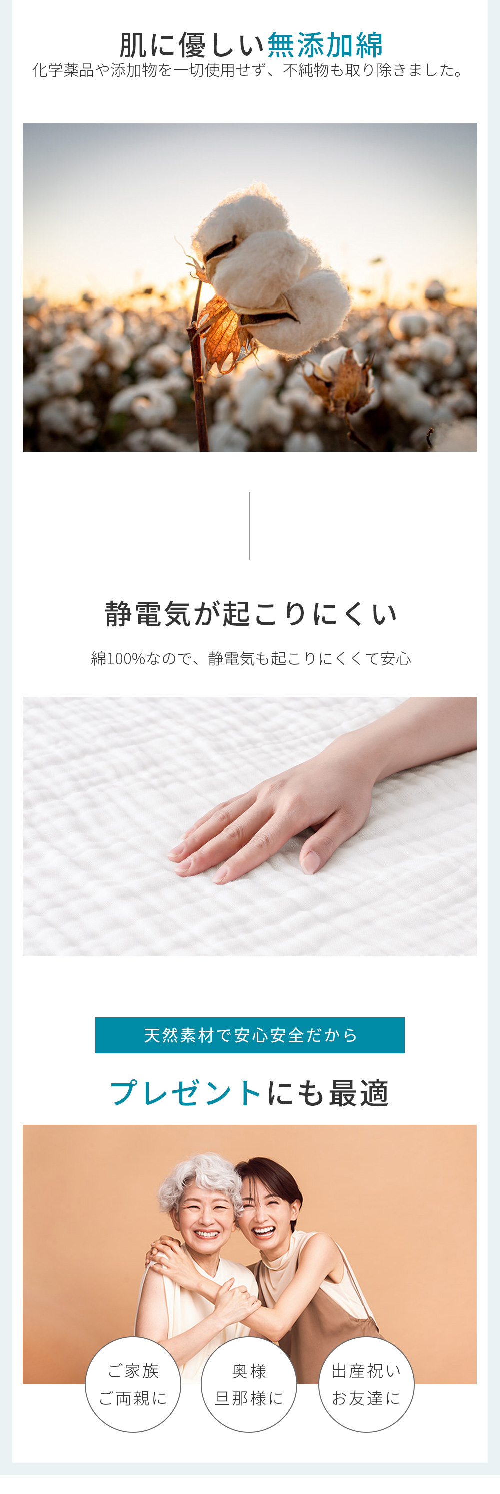 無添加綿とは、一般的な綿花を使用してはいますが、製造で刺激の強い化学薬品を使わずに糸や生地にしたものです。