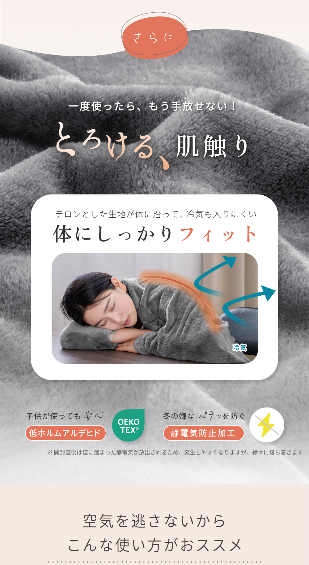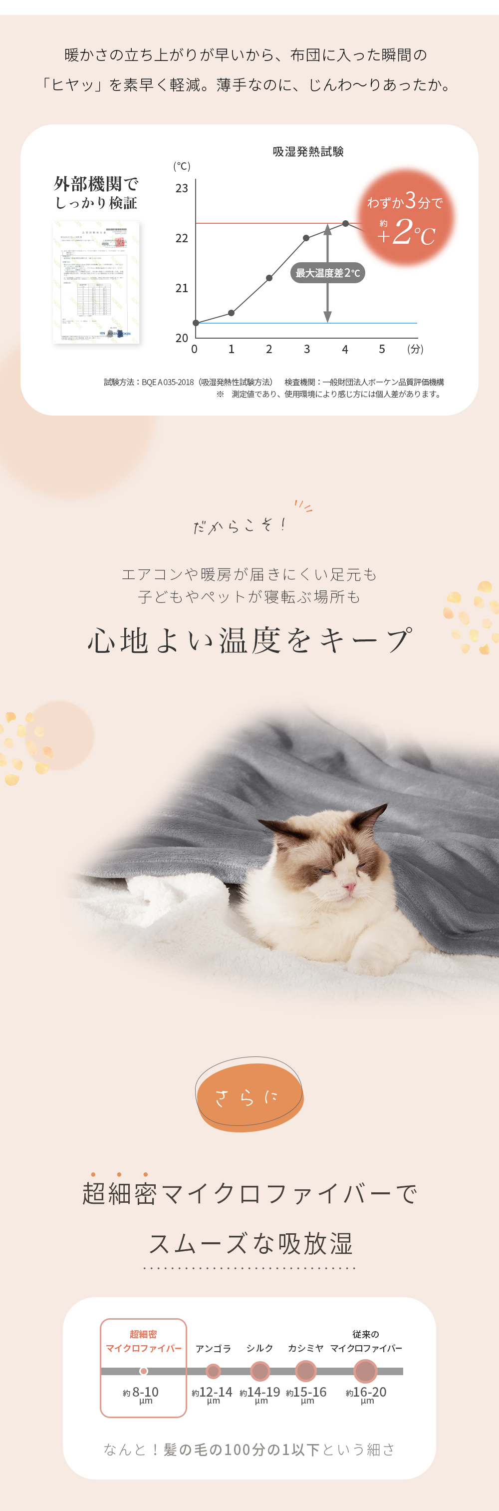 【高密度マイクロファイバー生地】一般的なブランケットより高密度で保温性が高く、軽いのにあったかい。キメ細やかなで、ふわふわ柔らか。「エコテックス100」認定。