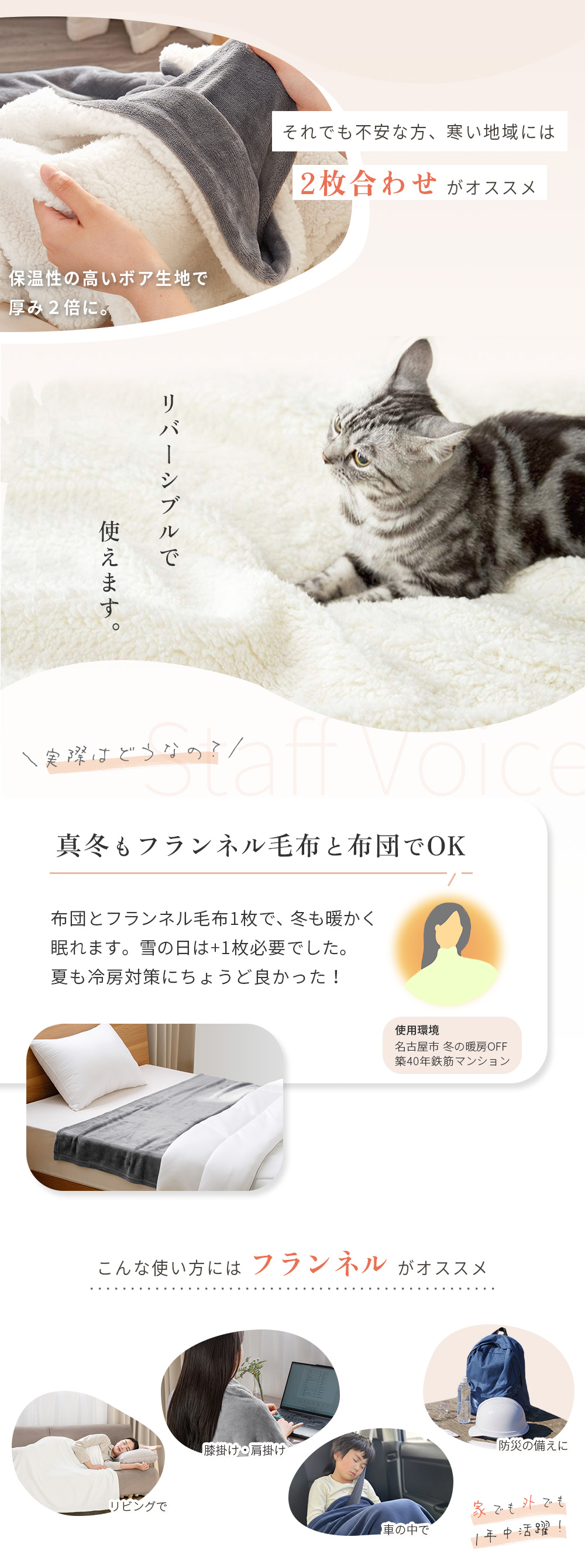【二枚合わせで保温性抜群】マイクロファイバーとシープボア2枚の毛布生地を重ね2枚合わせにすることで、空気の断熱効果により保温力アップ。