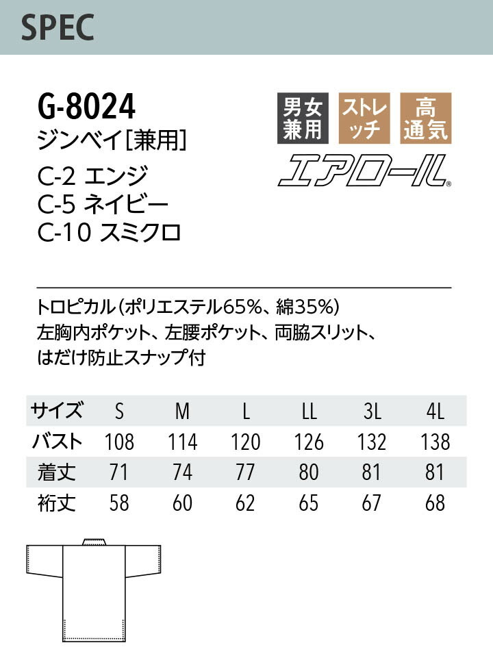 ジンベイ G-8024 メンズ レディース ストレッチ 高通気 厨房 和食 調理 レストラン カフェ チトセ arbe アルベ