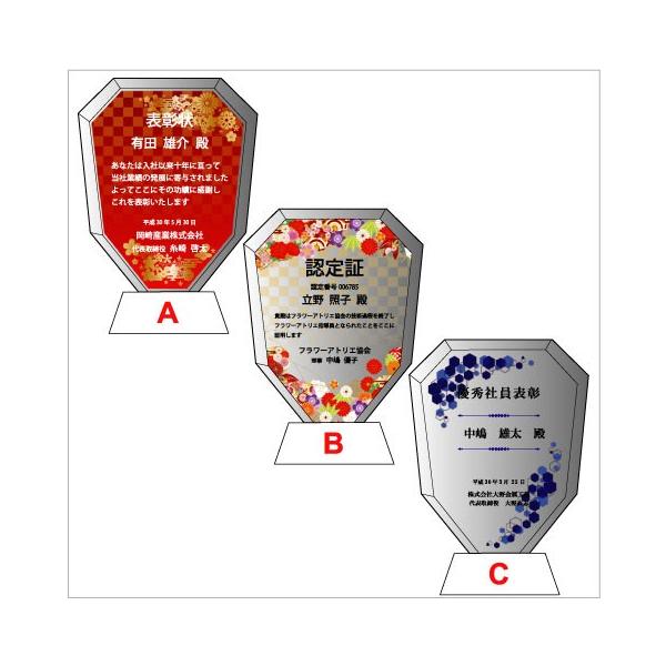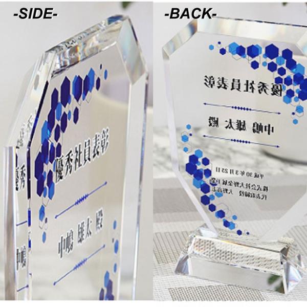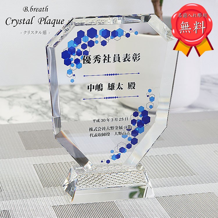 優勝・優秀賞・敢闘賞などのオーナメント。オリジナル名入れUVフルカラープリント加工で、各種記念を華やかにするクリスタル記念楯(盾)です。