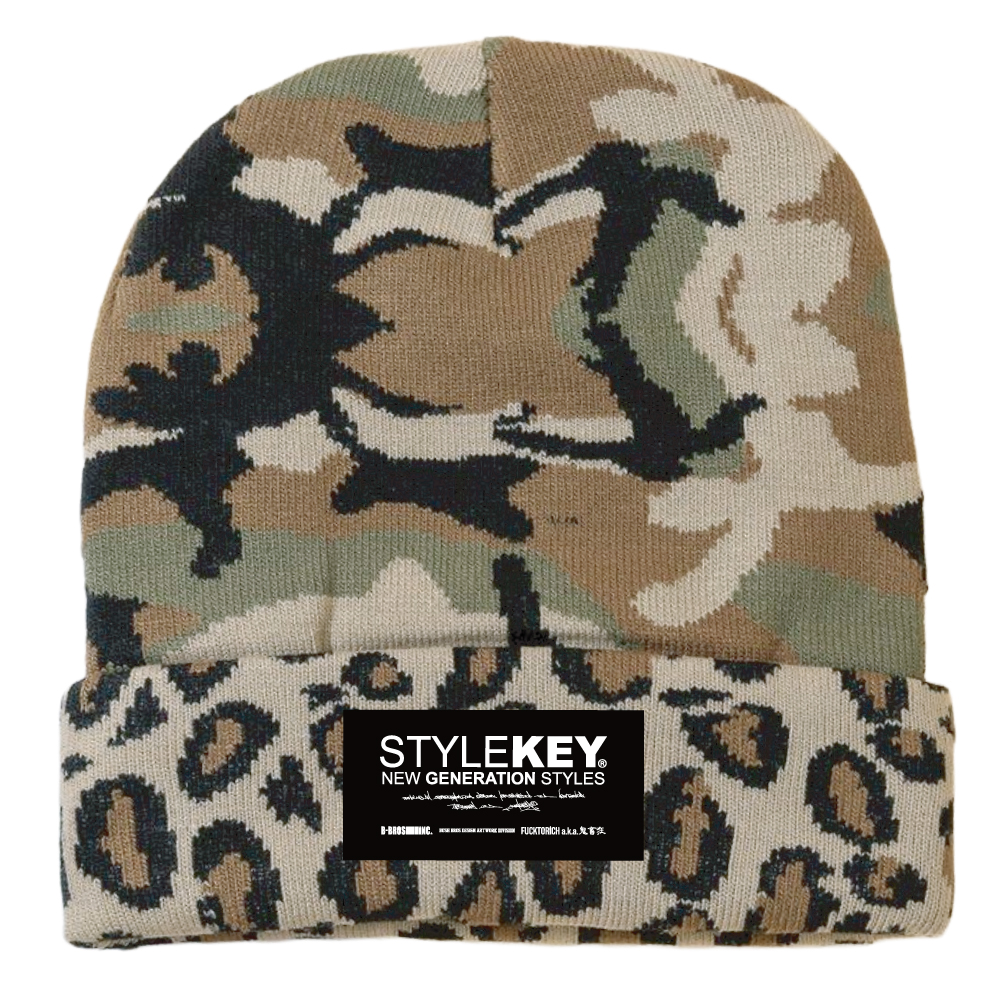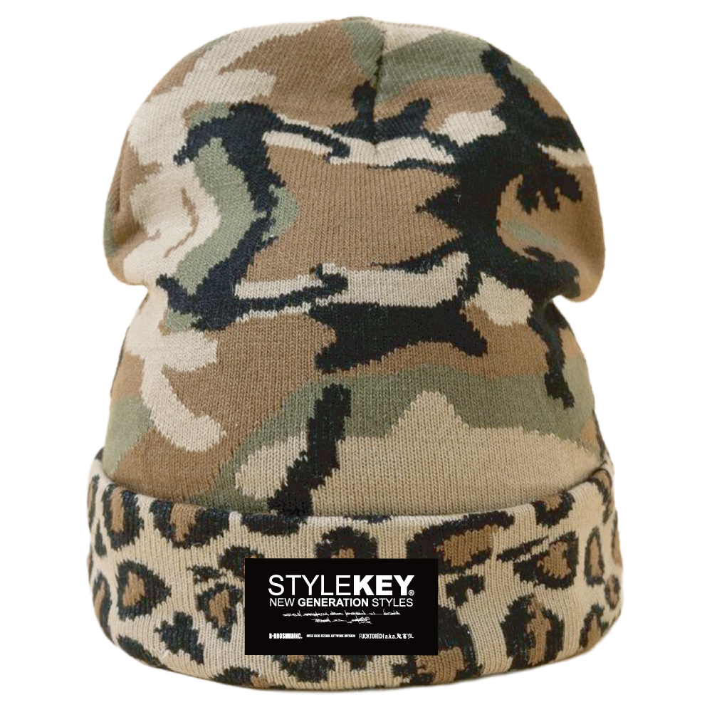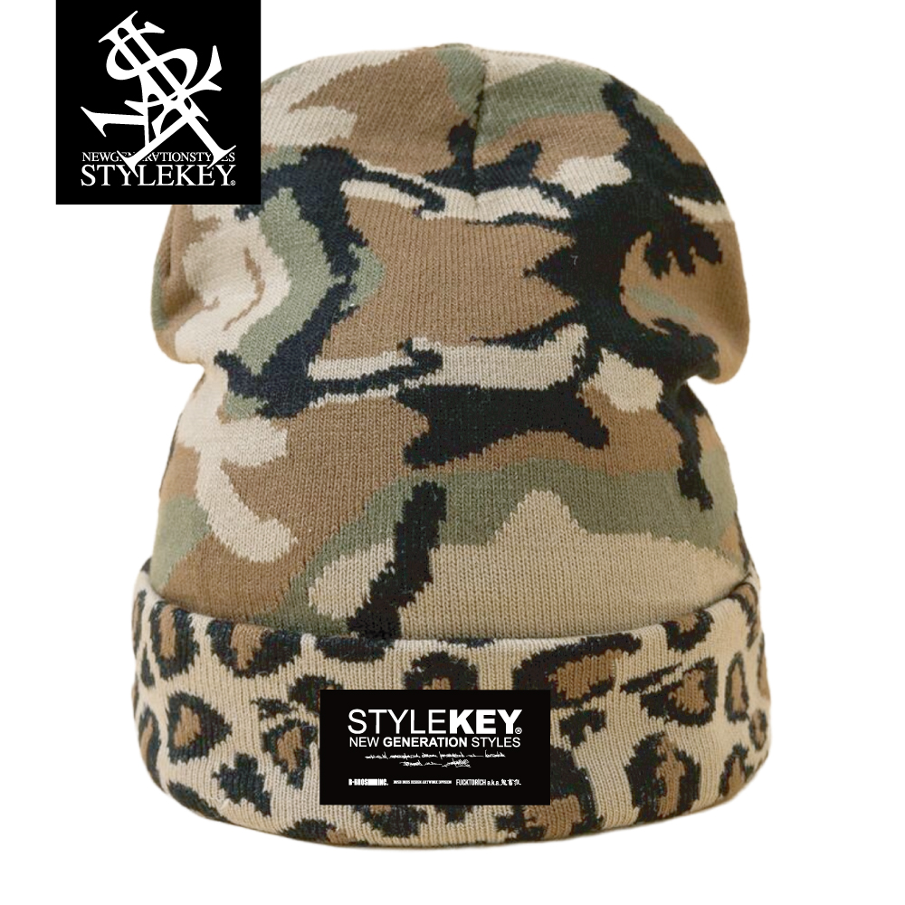 独自のデザインワークでストリートシーンを旋風するスタイルキーから迷彩柄をメインに折り返し部がヒョウ柄になった男女共におすすめなお洒落なニットキャップが登場。ブランドネームがさりげなく主張するこれからのシーズンにピッタリのアイテムです。