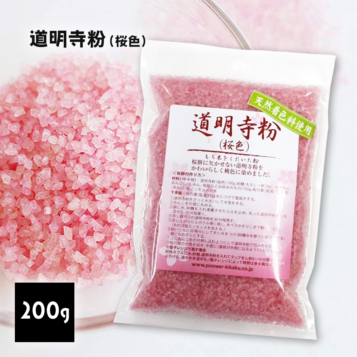 | 説明 | 桜餅にかかせない道明寺粉を天然着色料を使用して桜色に染めました。食紅で色をつける手間がなくてとても便利です。 |