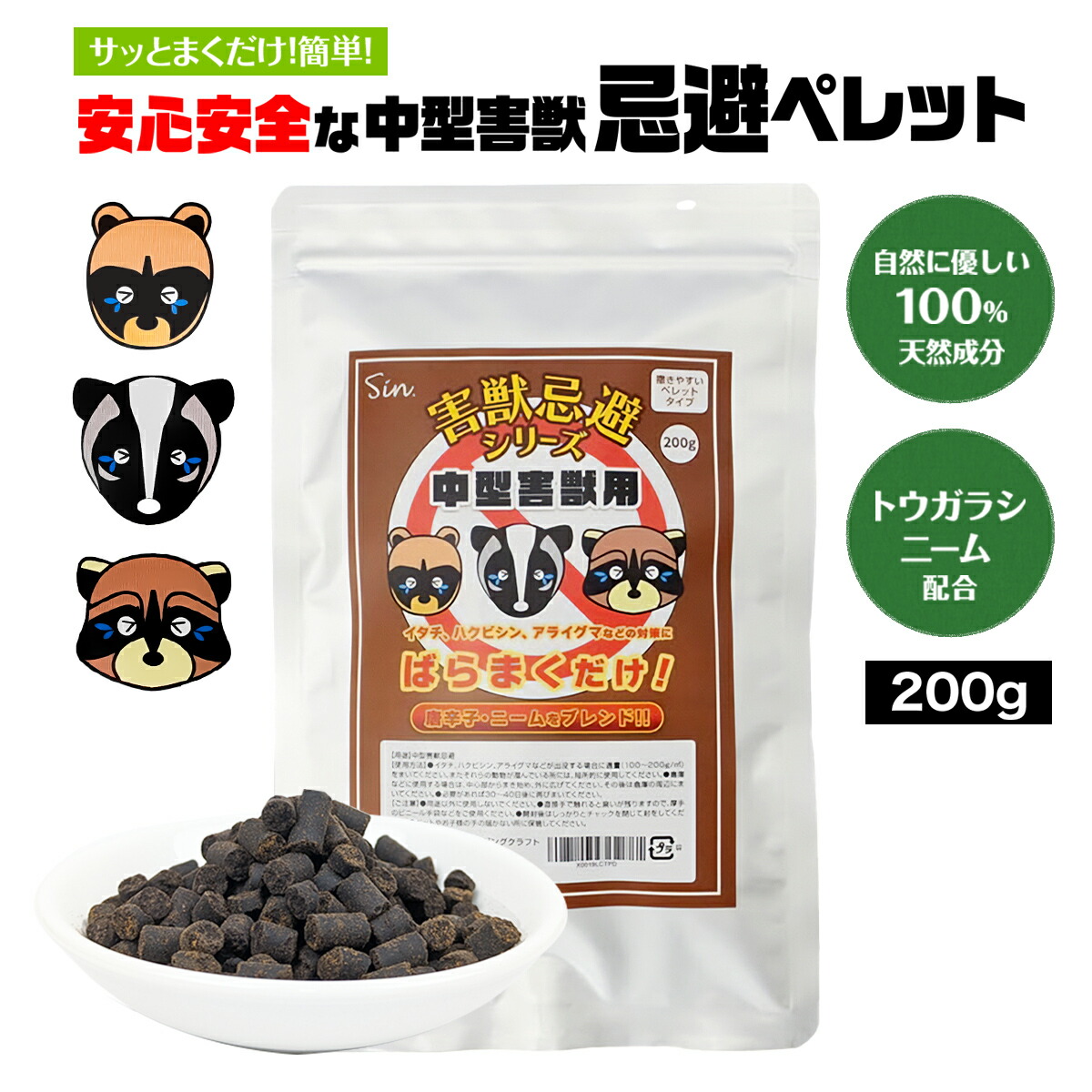 | 説明 | 害獣忌避 中型害獣 200g 大切な家や農作物を守るための強力な害獣対策アイテムです! - 天然素材使用! 害獣を遠ざける安心・安全なペレットタイプ。 - トウガラシ&ニームケーキ配合! 強力な刺激で忌避効果アップ。 - 特殊な匂いで侵入対策! ハクビシン、イタチ、アライグマなどの被害を軽減。 - 使い方は簡単! 気になる場所に撒くだけで手軽に害獣対策。 - 庭・畑・倉庫にも! 屋外の様々な場所で使用可能。 |