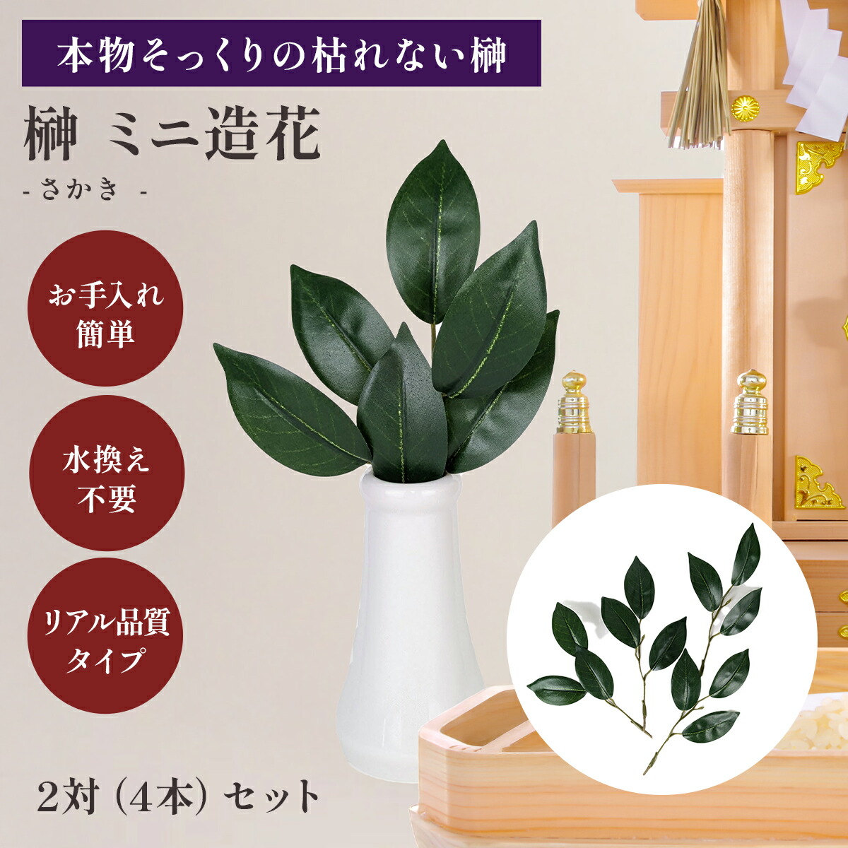 | 説明 | 本物そっくりの枯れないさかき(榊)のミニサイズ。 枯れないのでお手入れが簡単。 質感にもこだわった高品質な榊です。 サイズ:高さ約16cm×幅約10cm 茎長さ約4.5cm (枝の長さはハサミ等で調節してください) |