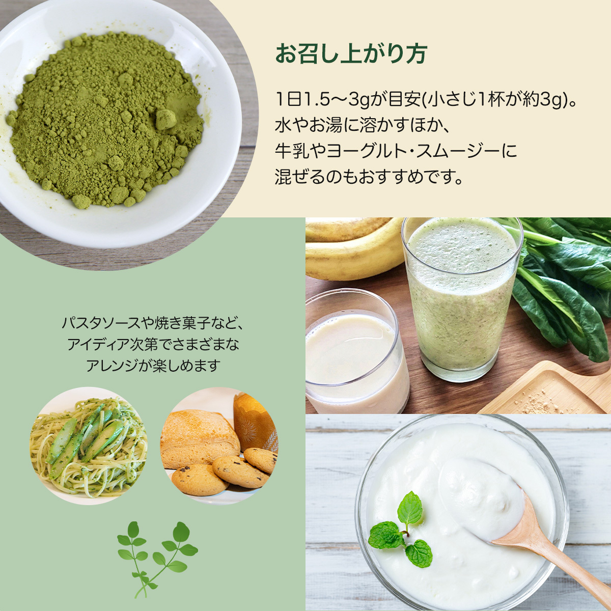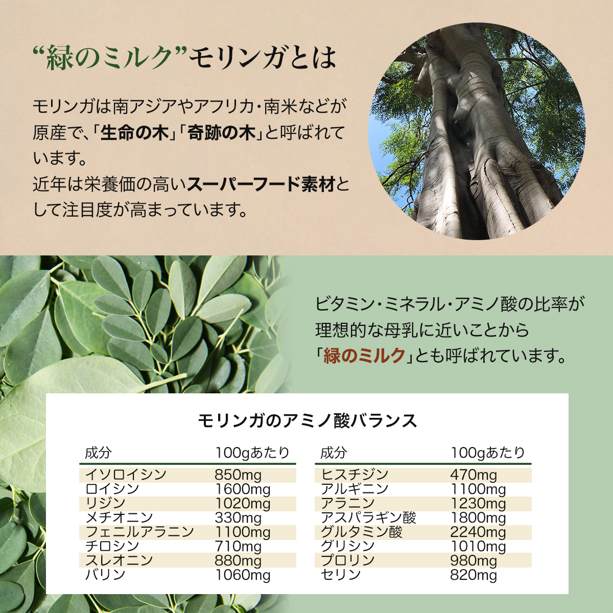 | 説明 | 豊富なアミノ酸を含むモリンガの葉の粉末です。 ビタミン・ミネラル・アミノ酸の比率が理想的な母乳に近いことから「緑のミルク」とも呼ばれています。 ギャバやポリフェノールも豊富に含まれています。 お湯に溶かしたり、料理やスイーツなどに混ぜてお召し上がりください。 |