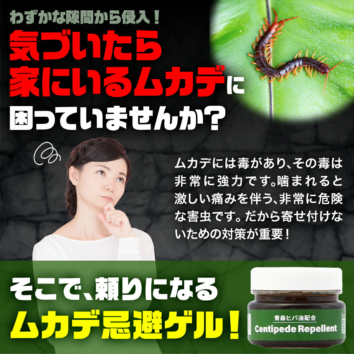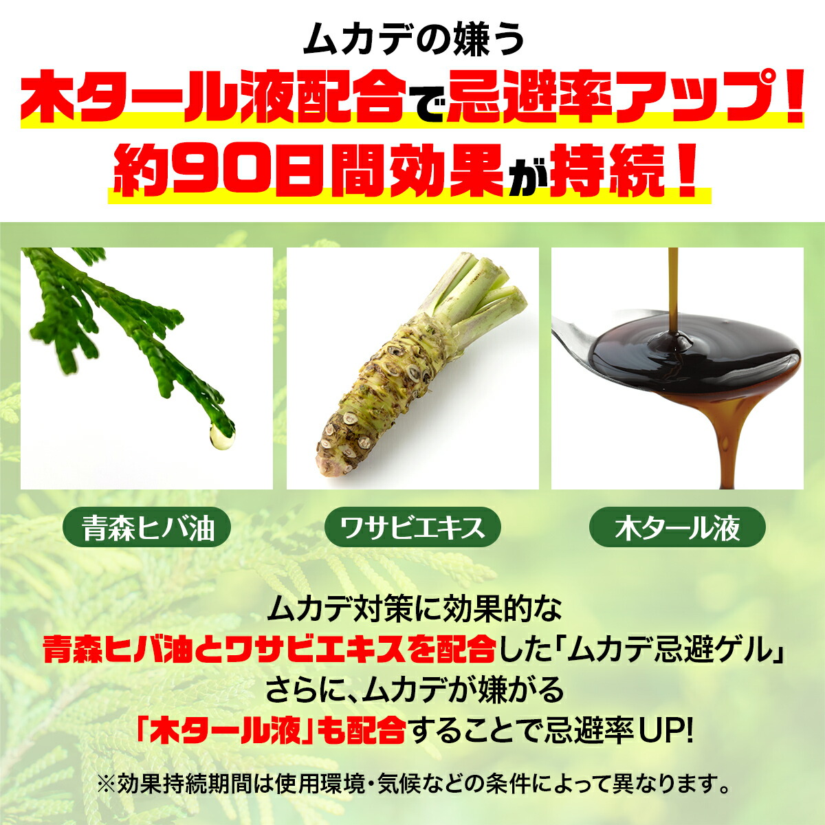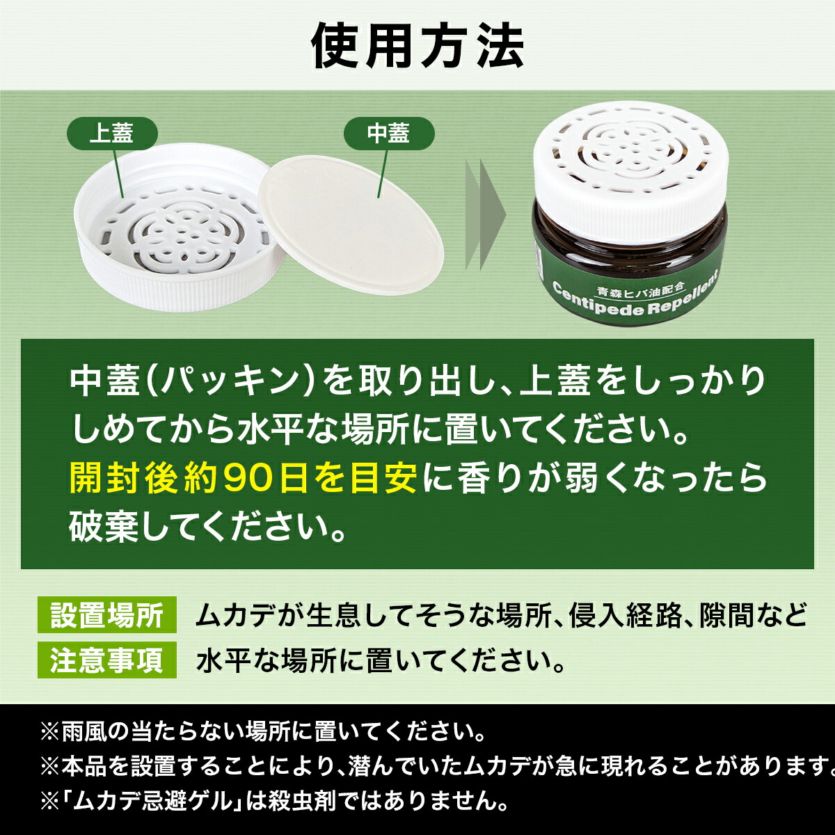 | 説明 | 天然精油の青森ヒバ油とワサビエキス配合のムカデ忌避剤です。 約90日間持続で経済的! 更にムカデの嫌う木タール液配合で忌避率アップ! ゲルタイプなので倒れてもこぼれません。 香りの系統→青森ひば, 木タール 色→黒 |
