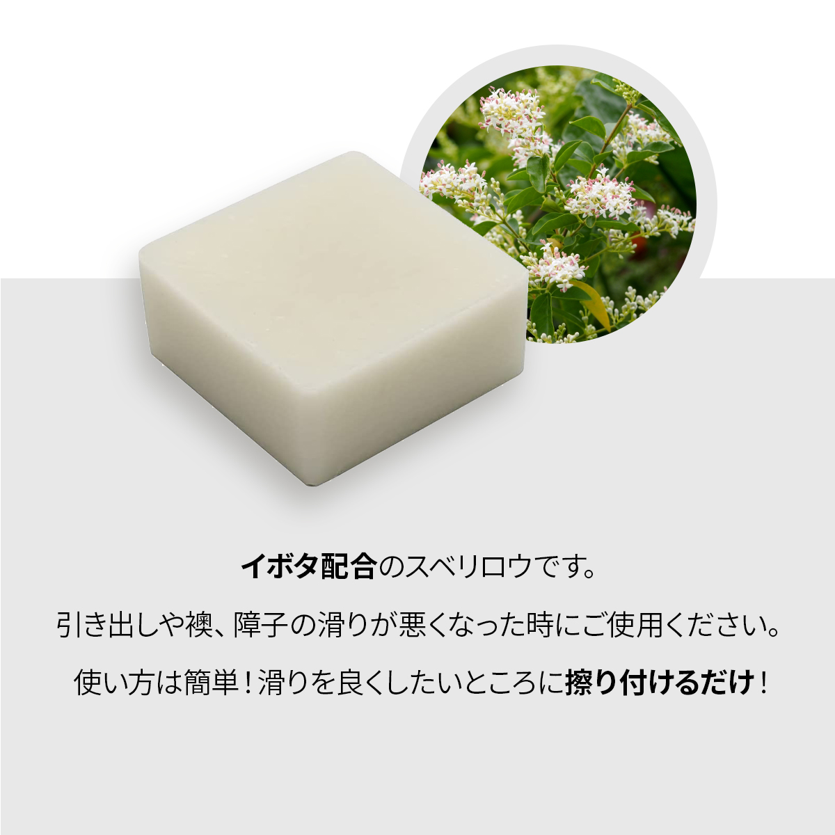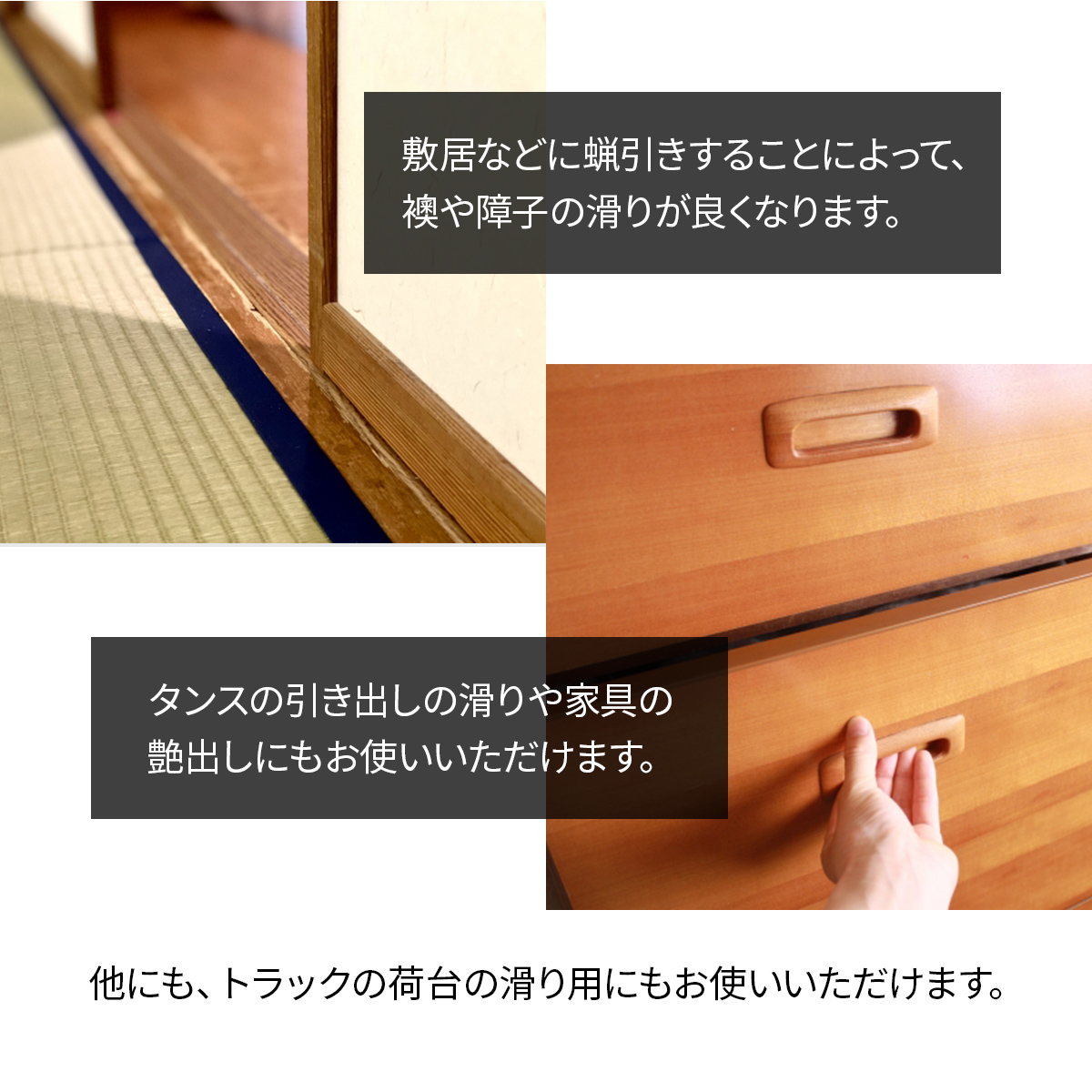 | 説明 | イボタ配合のスベリロウです。敷居などに蝋引きすることによって、襖や障子の滑りが良くなります。タンスの引き出しの滑りや家具の艶出しにもお使い頂けます。トラックの荷台の滑り用にもお使い頂けます。 |