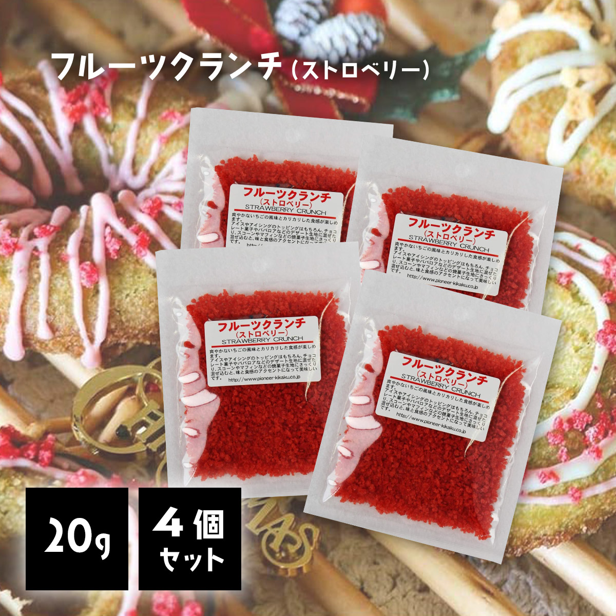| 説明 | 爽やかなストロベリーの風味とカリカリした食感が楽しめます。アイスやアイシングのトッピングはもちろん、チョコレート菓子やババロアなどのデザート生地に混ぜたり、スコーンやマフィンなどの焼菓子生地にさっくり混ぜ込むと味と食感のアクセントになります。 |
