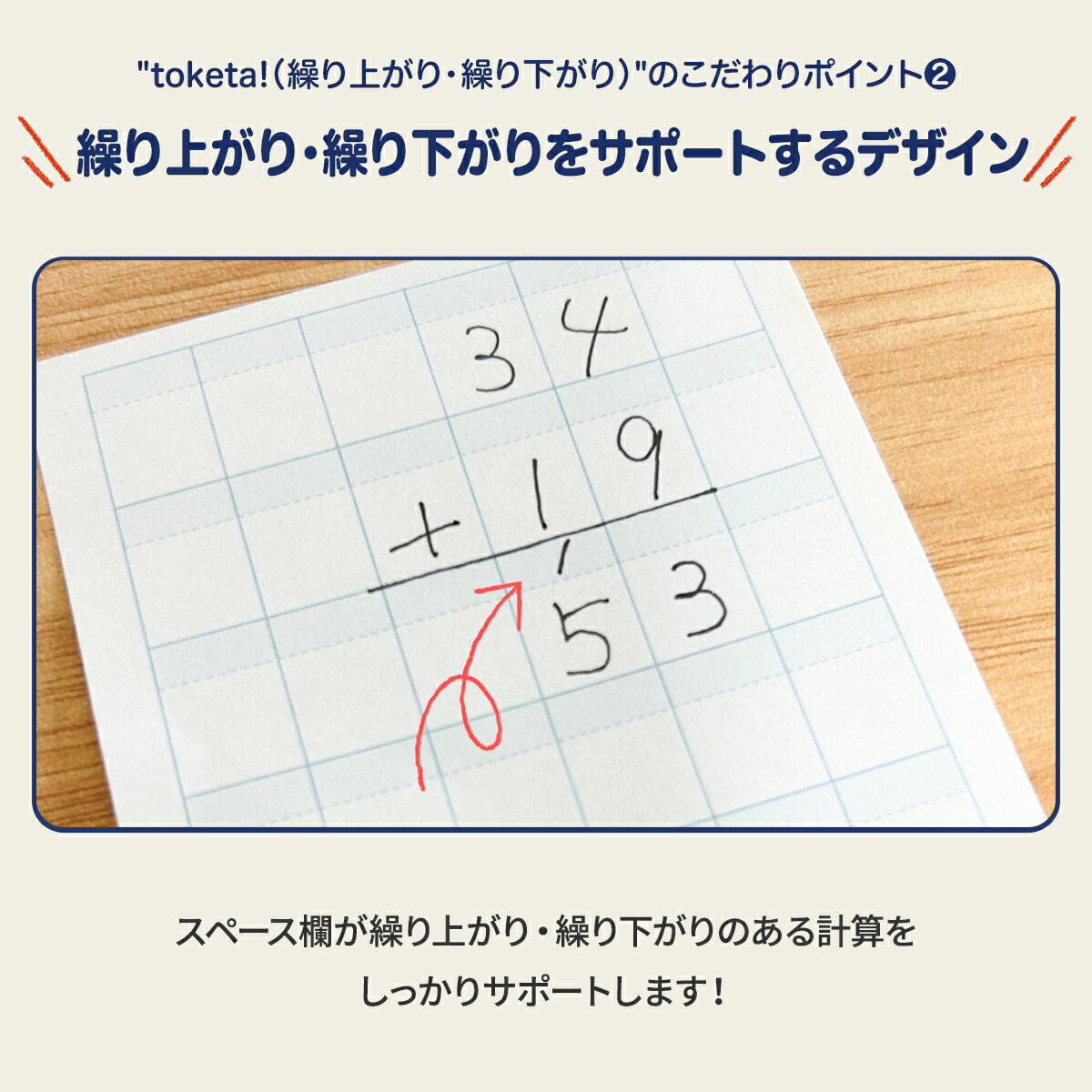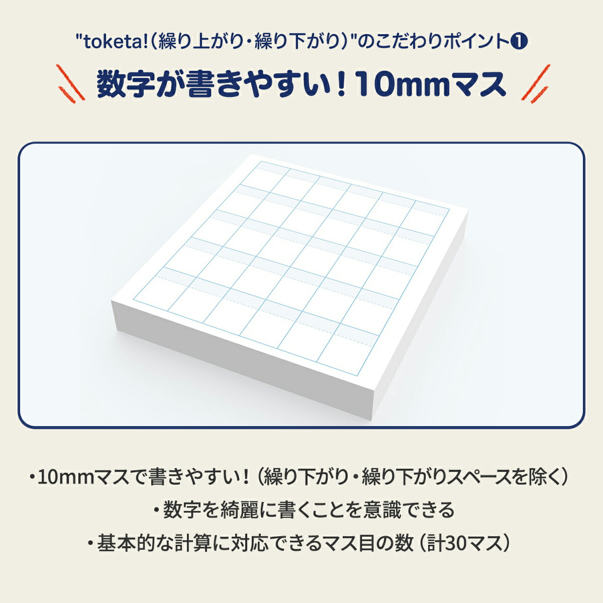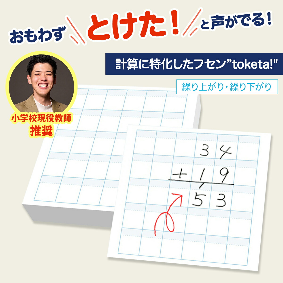 | 説明 | 計算用フセン 【Toketa!(算数用)大サイズ】【繰り上がり・繰り下がり】 おもわず「とけた!」と声がでた。 そんな尊い瞬間に寄り添える 優しいフセンができました。 筆算の繰り上がり・繰り下がりの学習に最適な大きいサイズを採用しました。 【製品仕様】 色:ホワイト サイズ:70×75 mm マス目サイズ:10mmマス(リーダー付き) マスの数:6×5マス(計30マス) 個数:1冊 枚数:100枚/1個 ノリ幅:14 mm(上辺から) その他:ミシン目付き |