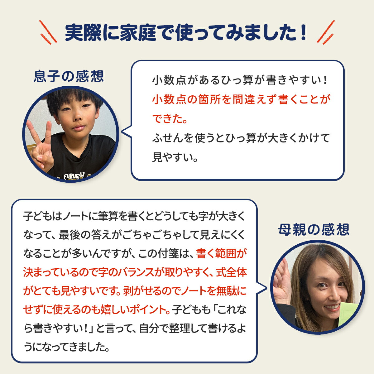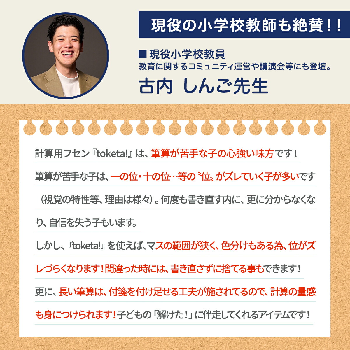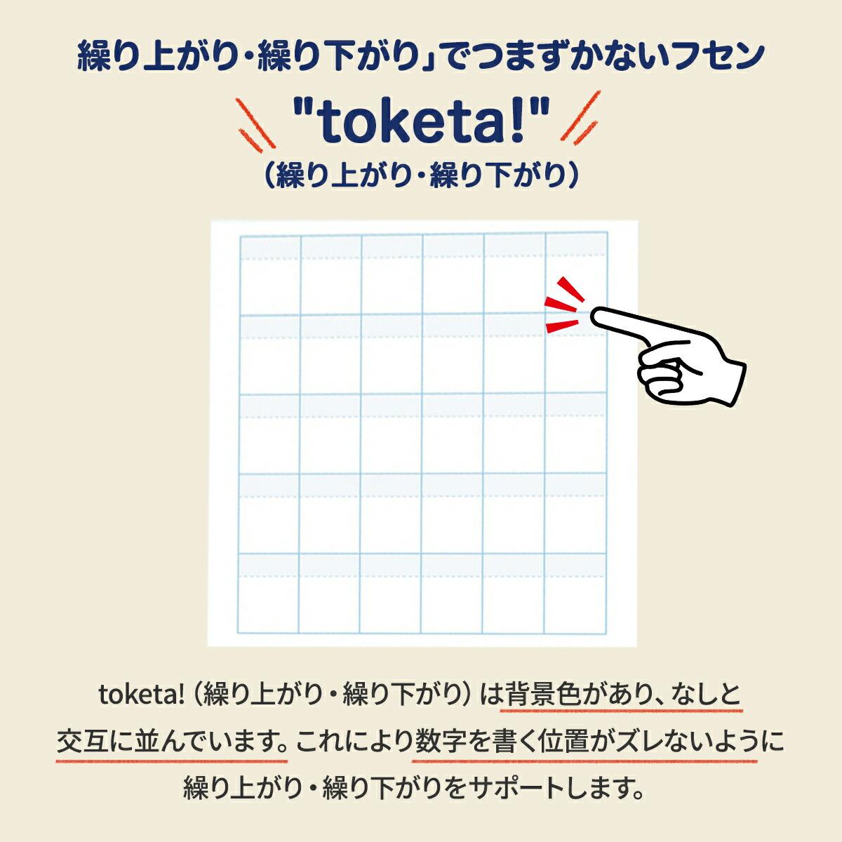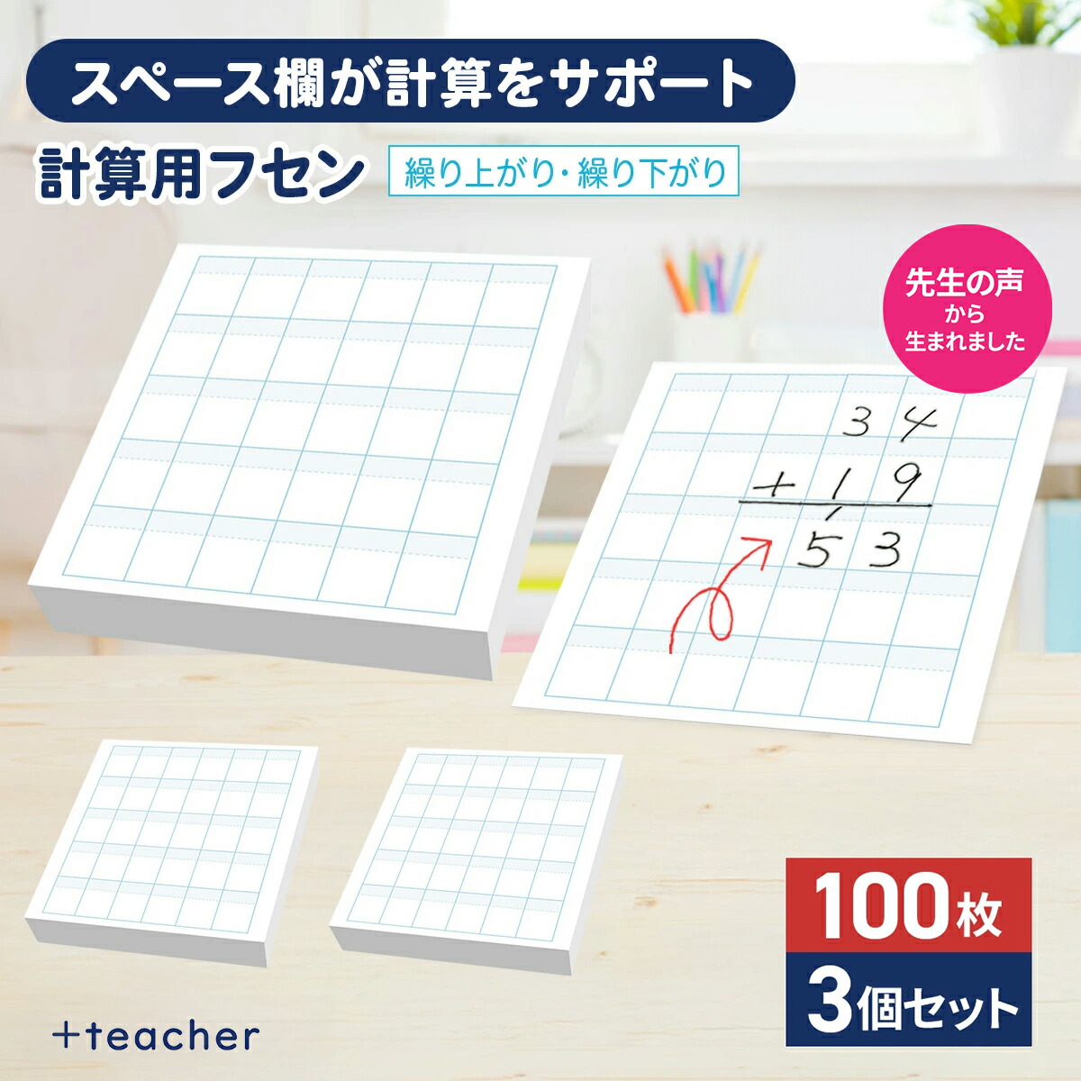 | 説明 | 計算用フセン 【Toketa!(算数用)大サイズ】【繰り上がり・繰り下がり】 おもわず「とけた!」と声がでた。 そんな尊い瞬間に寄り添える 優しいフセンができました。 筆算の繰り上がり・繰り下がりの学習に最適な大きいサイズを採用しました。 【製品仕様】 色:ホワイト サイズ:70×75 mm マス目サイズ:10mmマス(リーダー付き) マスの数:6×5マス(計30マス) 個数:1冊 枚数:100枚/1個 ノリ幅:14 mm(上辺から) その他:ミシン目付き |