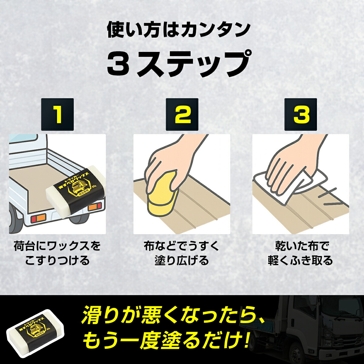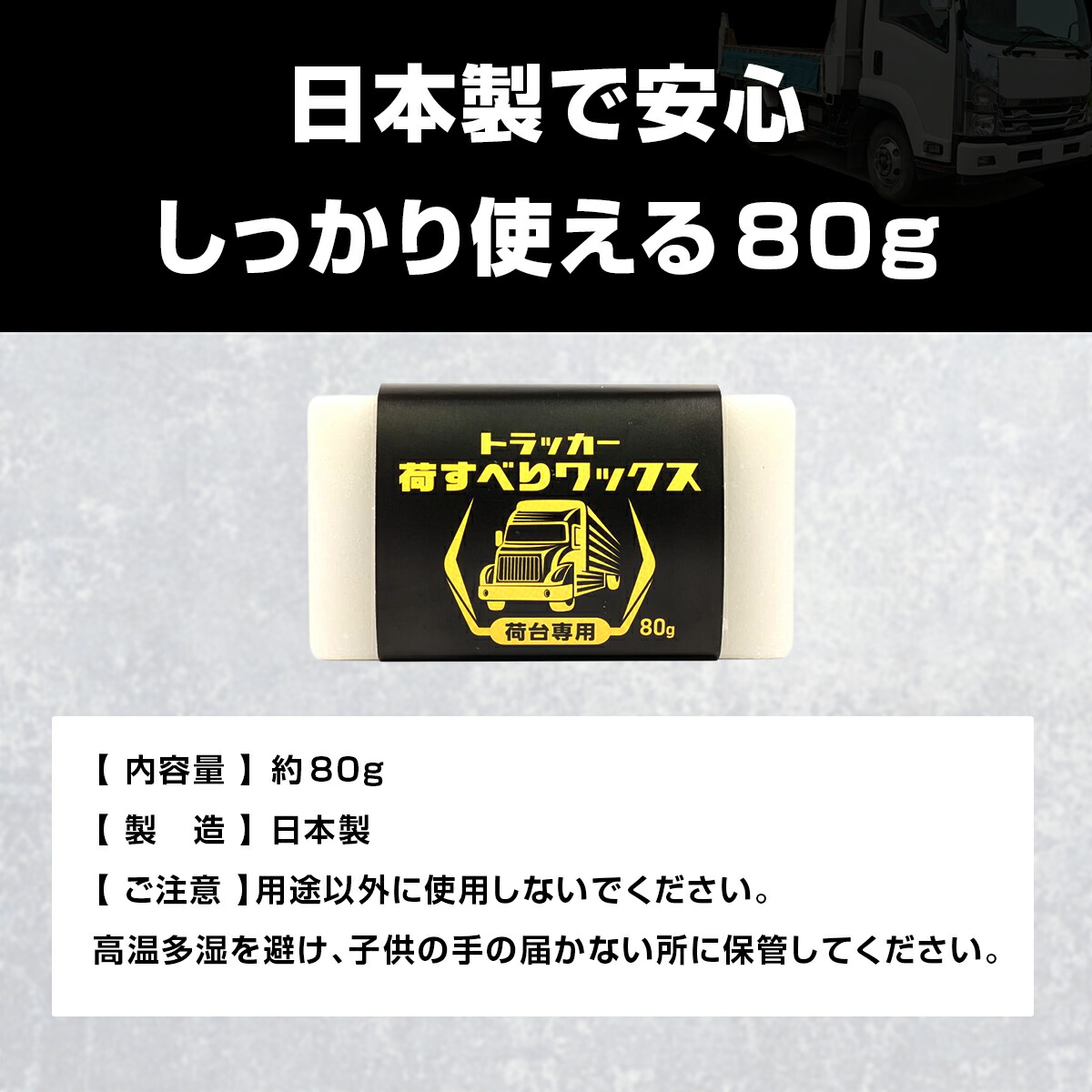 | 説明 | 〜トラックの荷台作業をもっとスムーズに〜 トラッカー 荷滑りワックス 80g 荷物のすべりが良くなる、トラックの荷台作業専用ワックス。積み下ろしの手間を軽減します。 \使い方は簡単/ 荷台に薄く塗り込んで乾拭きするだけでOK! 滑りが悪くなったら再施工することで効果が持続します。作業効率アップに繋がる、現場で頼れる1本。日本製で安心の品質です。 ブランド名:Sin. |