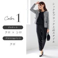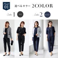サテンの切り替えが顔まわりをすっきり見せてくれるノーカラージャケットとブラウス・テーパードパンツの3点セットスーツです。
