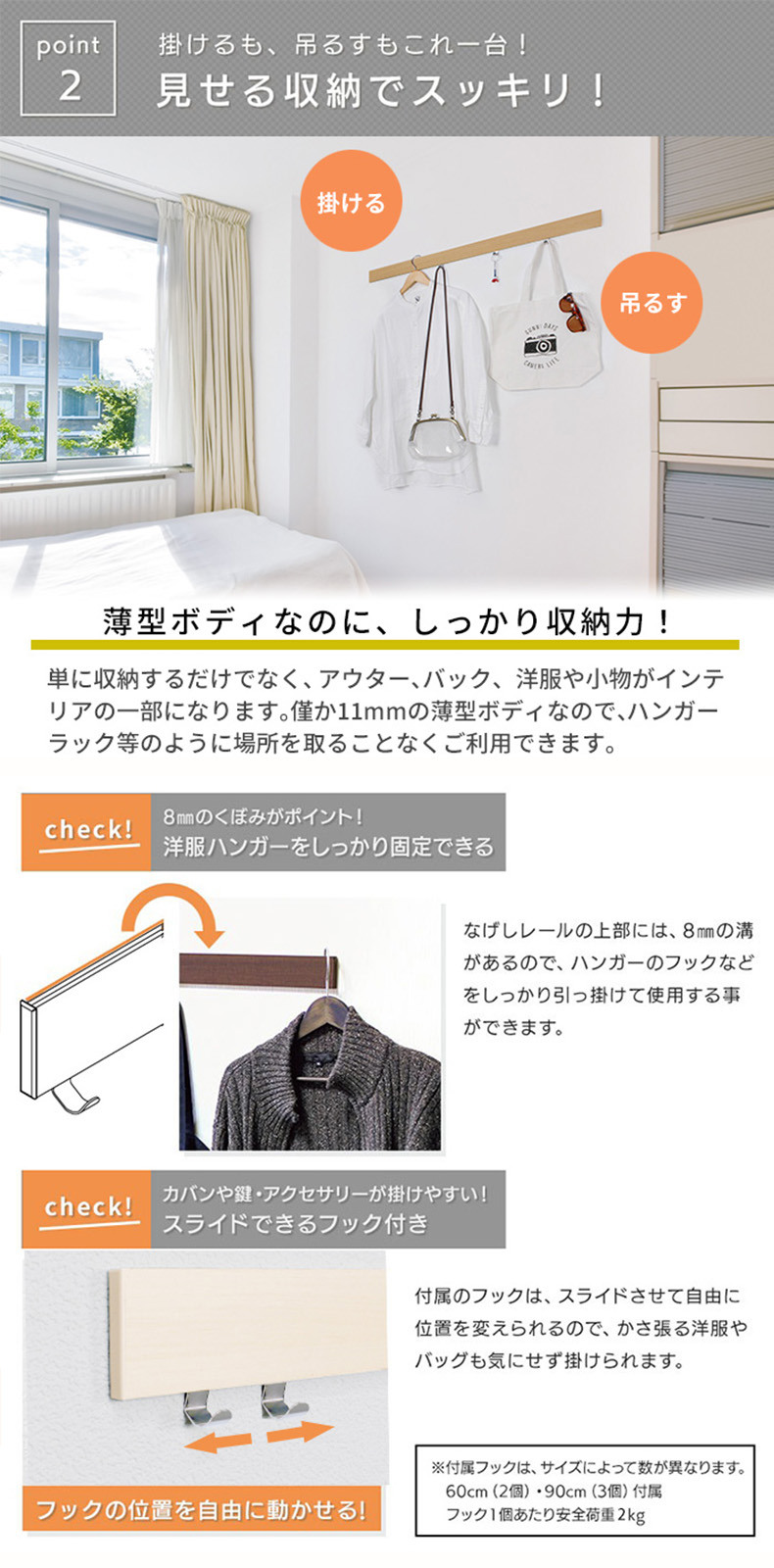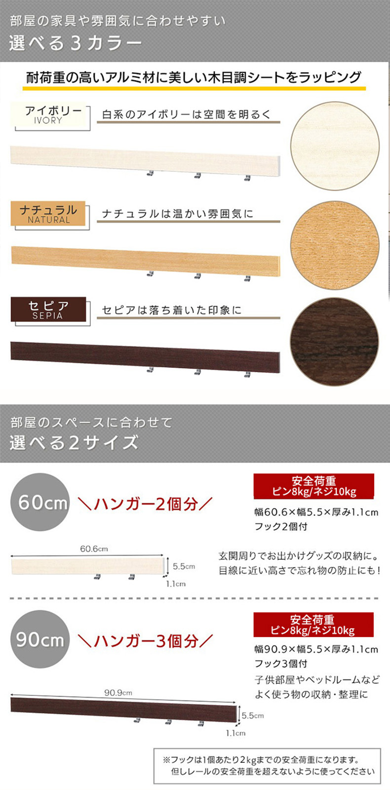 <フック1個あたり2kg>※但しレールの安全荷重を超えないように使ってください。