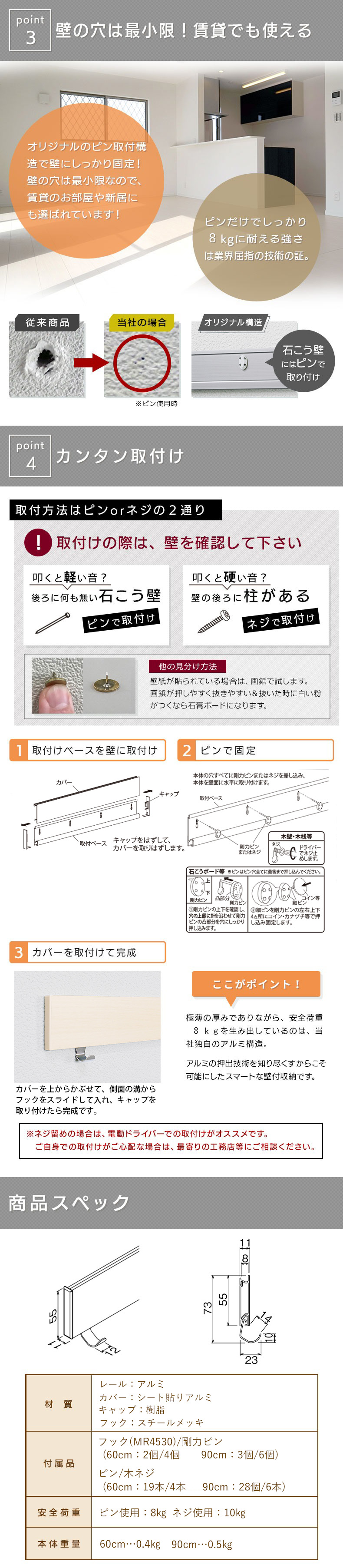 【材 質】レール:アルミ、カバー:シート貼りアルミ、キャップ:樹脂、剛力ピン:樹脂・ステンレス、ネジ:スチール、フック:スチール