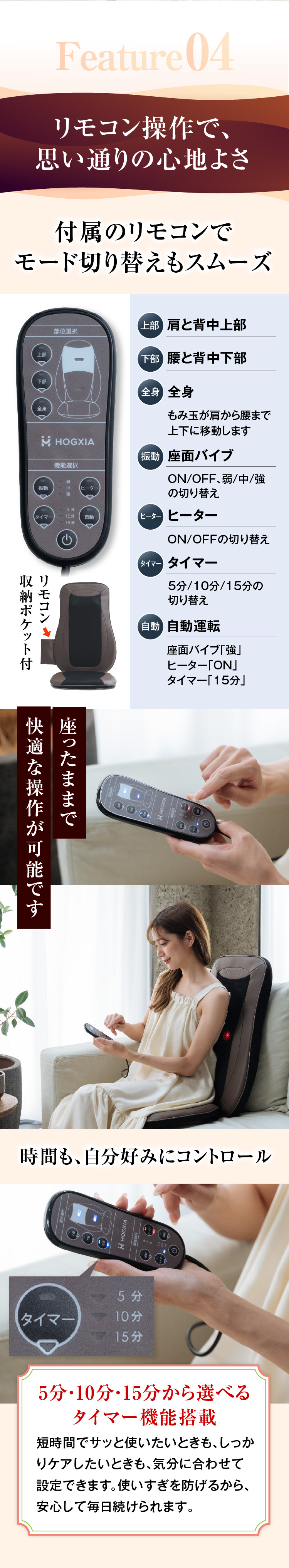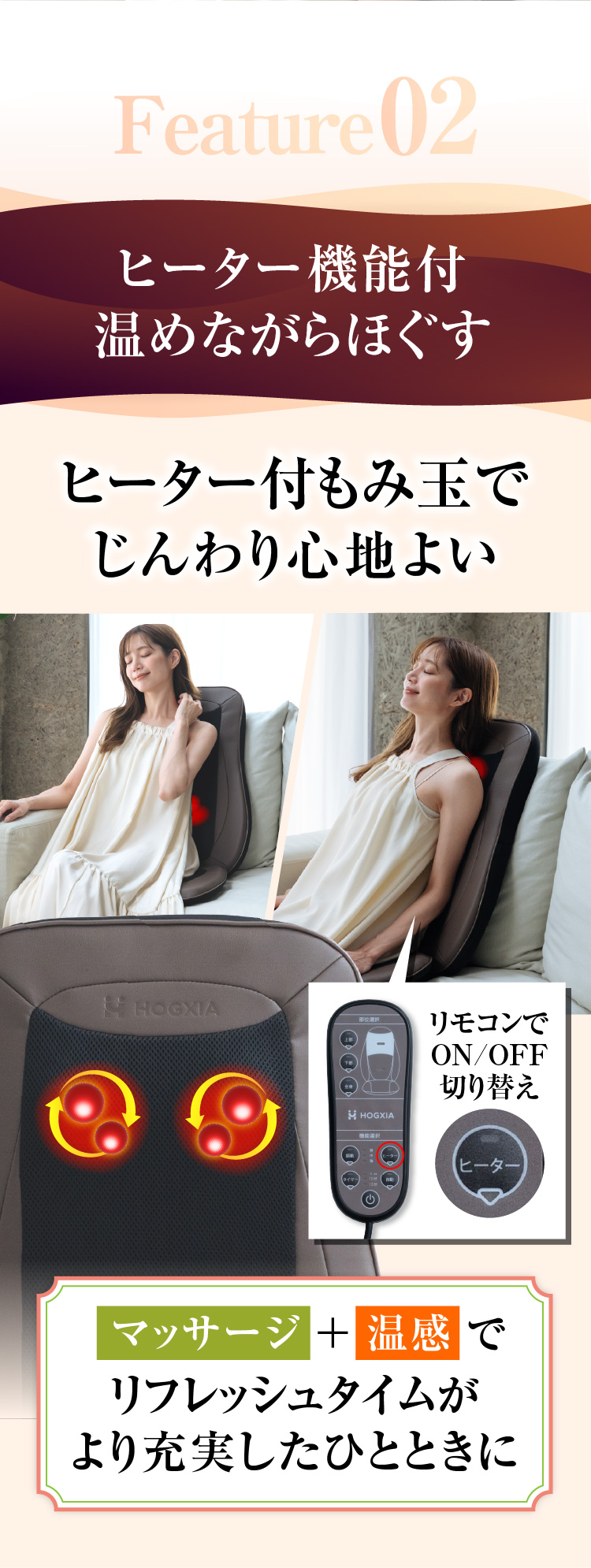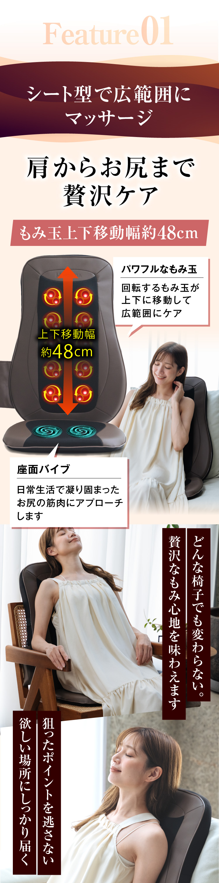 ・【 本格的な力強いもみを実現 】…大小4つのもみ玉が上下にスライドし、広範囲にマッサージします。座面バイブ機能でより心地よく!