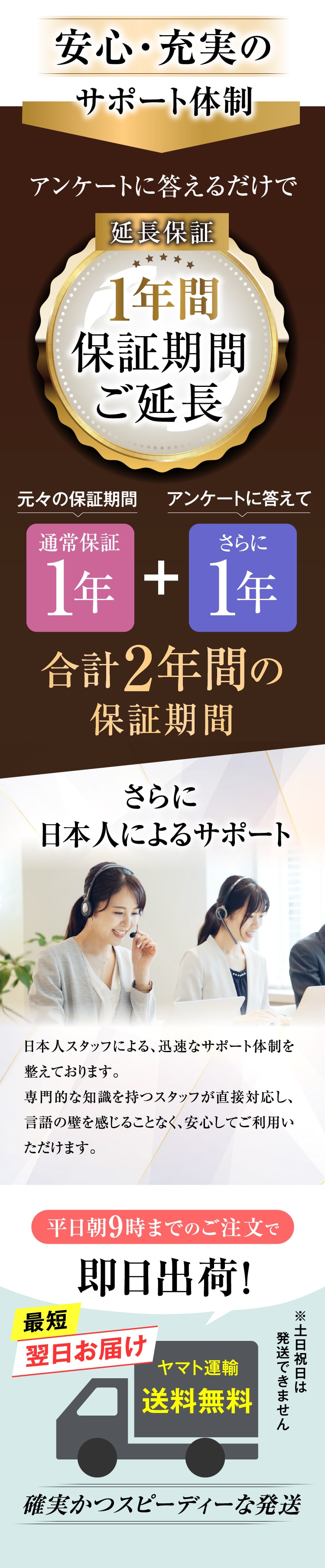 ・【 国内メーカーの1年間サポート 】… 日本人によるサポート体制も充実。1年間の保証制度(最大2年間)をご用意しております。