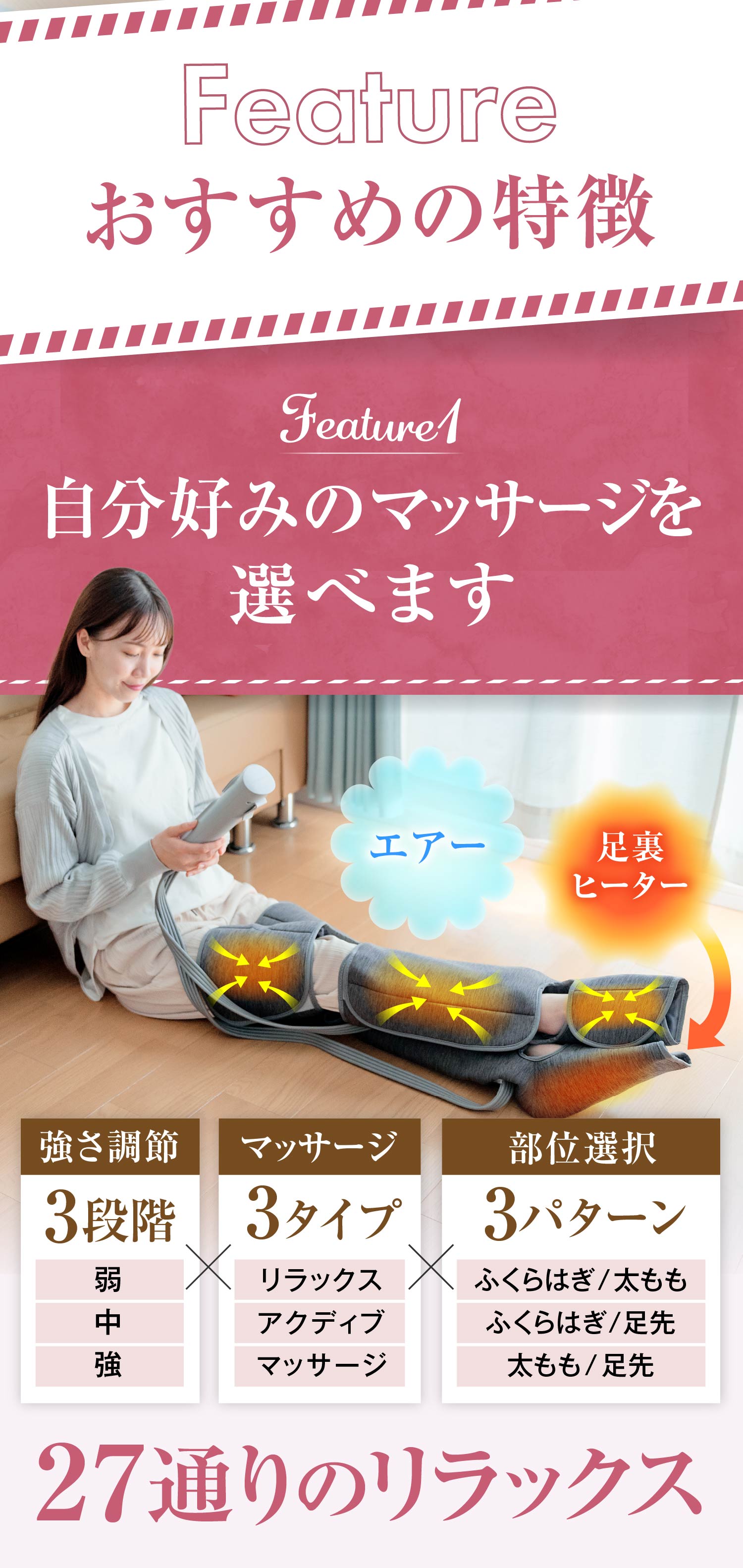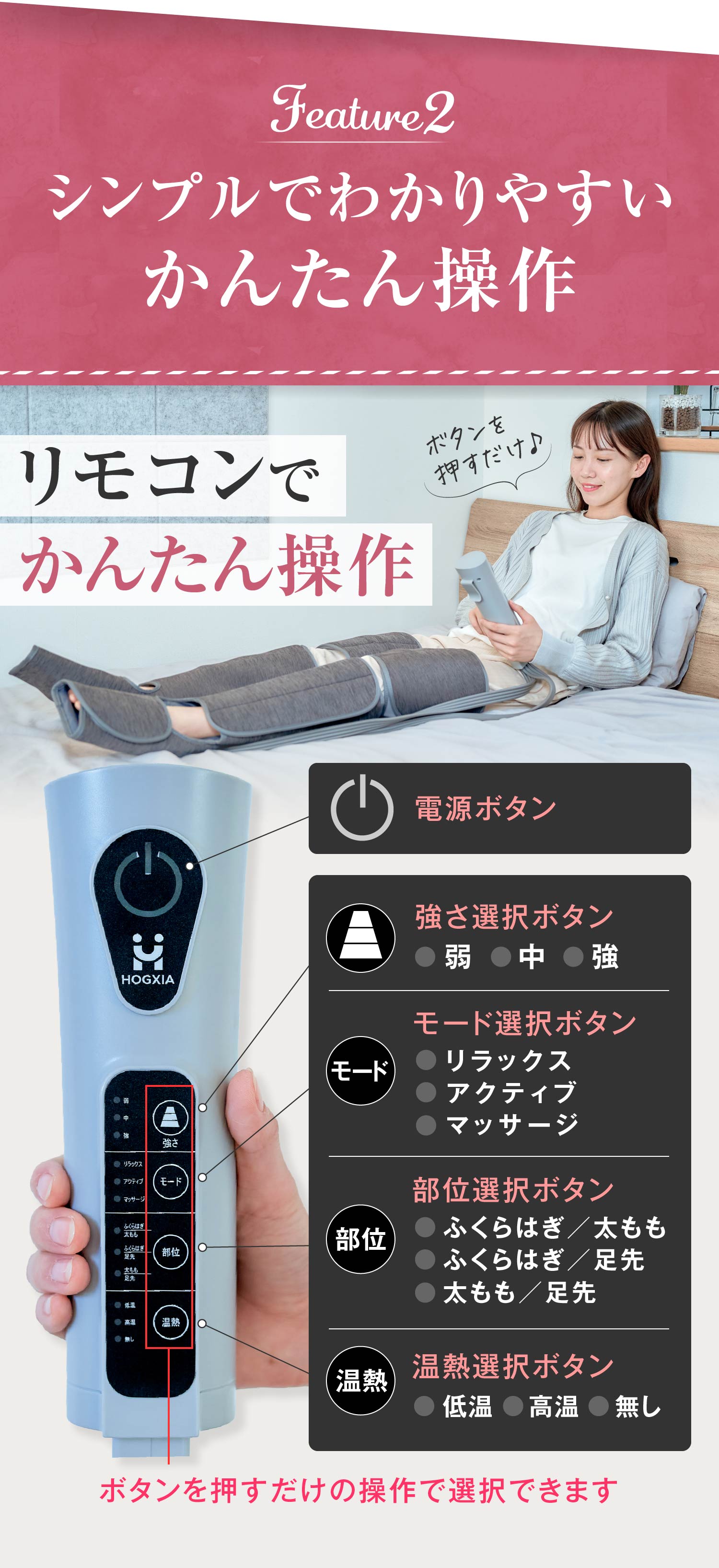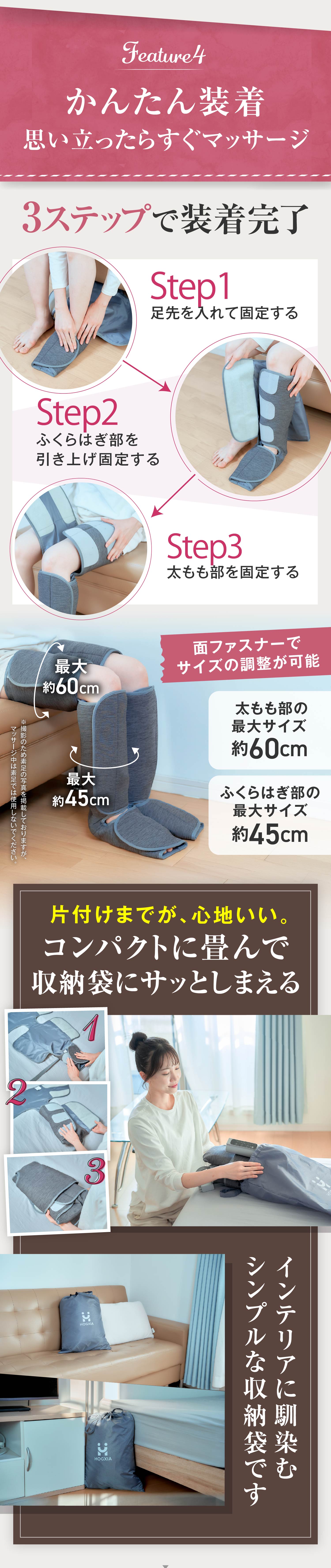 ・【 太ももから足先まで 】…脚全体を包み込むようにマッサージ。ふくらはぎ・ふともも・足先の部位選択と、3種類のモード選択でスッキリ気分爽快