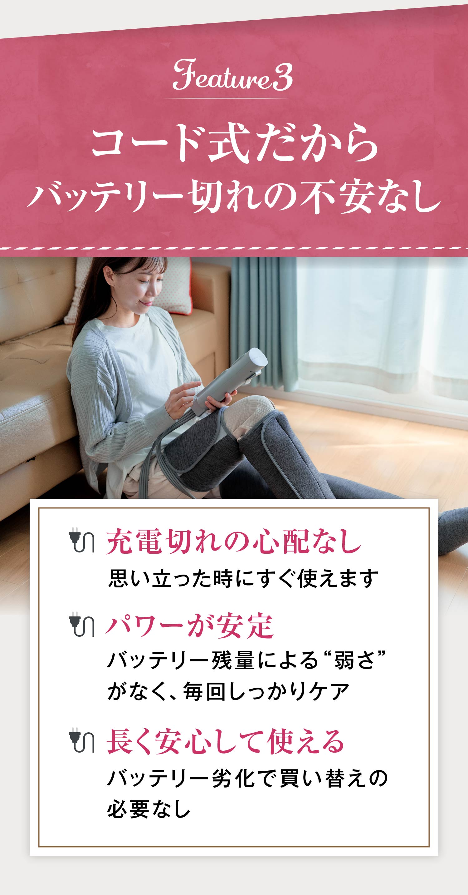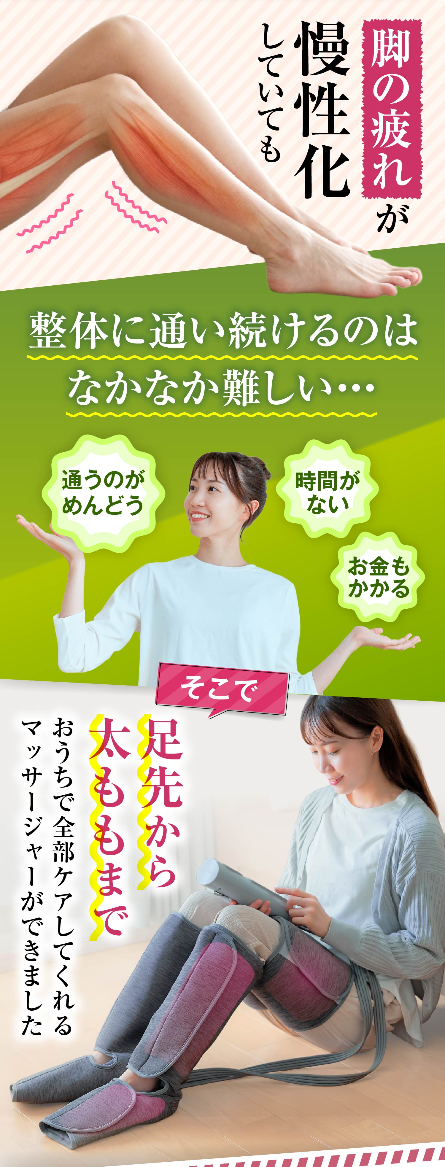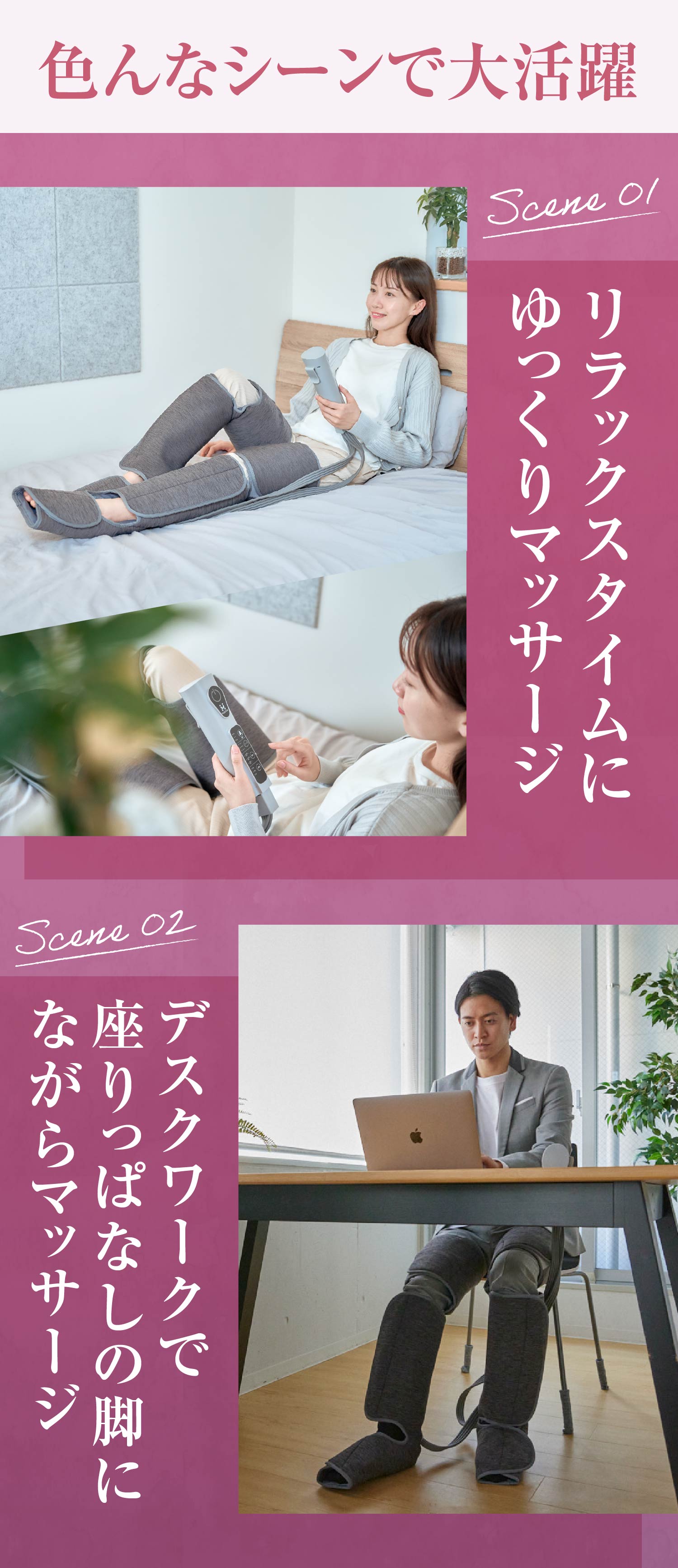 ・【 太ももから足先まで 】…脚全体を包み込むようにマッサージ。ふくらはぎ・ふともも・足先の部位選択と、3種類のモード選択でスッキリ気分爽快