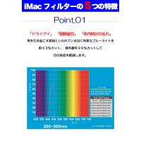 商品スペック特長 | ・「ドライアイ」「目の疲れ」「頭痛」「体内時計の乱れ」等を引き起こす原因といわれている、ブルーライトを約43%カットして目の負担を軽減します。 ・画面がくっきり見える光沢タイプです ・iMacに吊り下げるだけで使用できます | 内容物 | ・フィルター(本体) ・クリーニングクロス ・粘着シート ・取扱説明書 | 仕様 | 【サイズ】 W528 x H379 xD20 mm 【フィルター特性】 ・ブルーライトカット率 : 約43% (380〜495nmの平均値) ・可視光線透過率 : 約78% ・UVカット率 : 約99% 【材質】アクリル 【表面硬度】約2H 【原産国】台湾