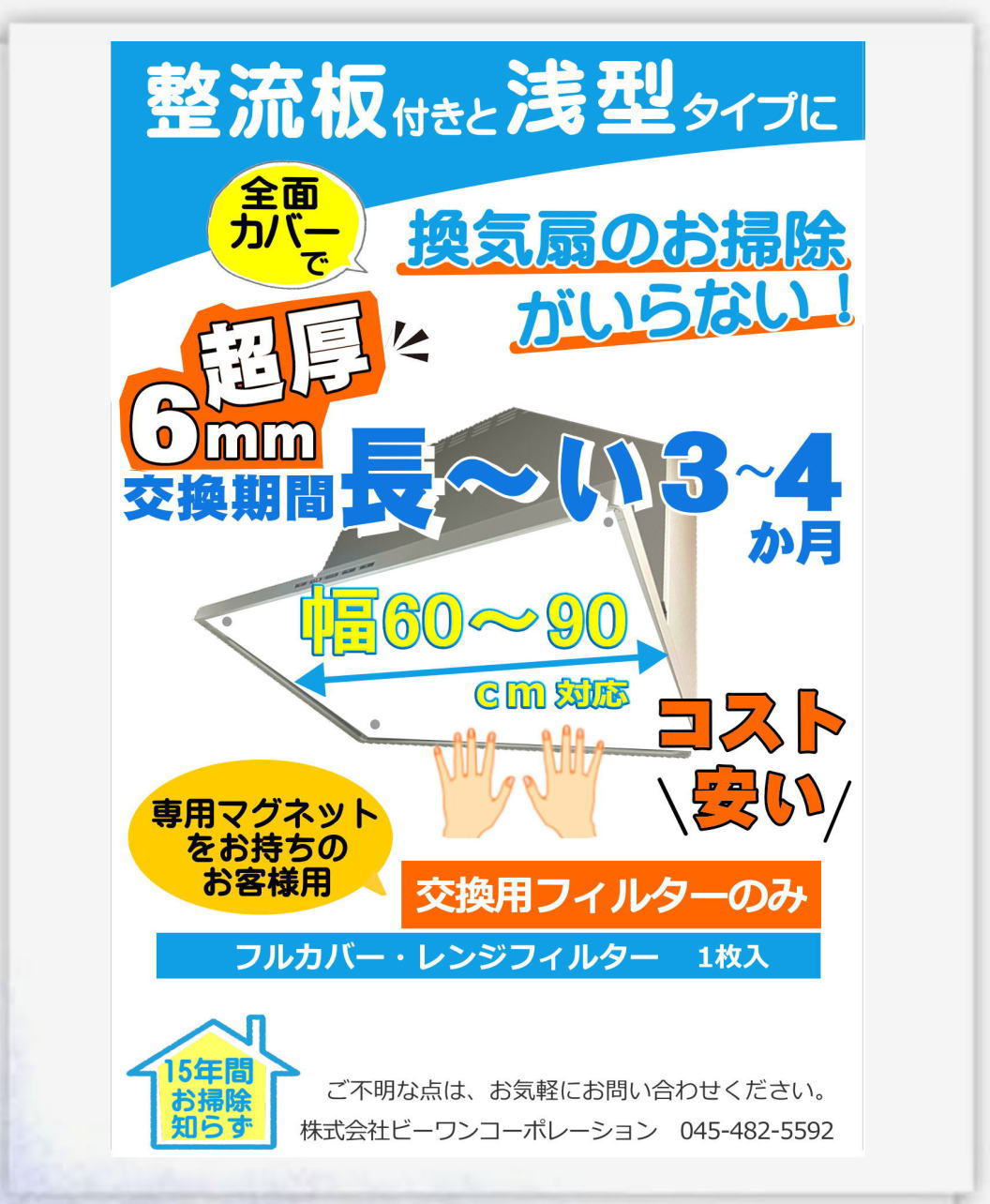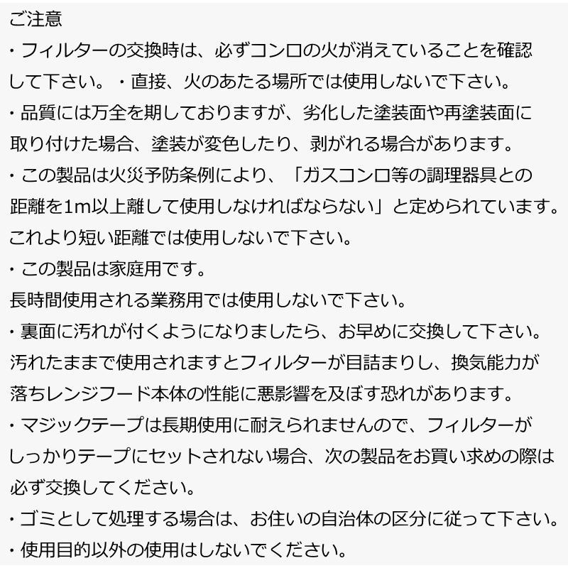 初めてのお客様は初めは「磁石付き」をご購入下さい。また、マジックテープでも落下の危険がありますのでご注意ください。※深型・ブーツ型のレンジフードには、別途、深型用の「 ハーフカバーフィルター 」をご使用ください。整流板付きレンジフード・浅型レンジフードの全面すべての油汚れを防止します。使い捨てだからお掃除の手間を劇的に軽減し、換気扇のキレイを保ちます。マグネットタイプのフィルターなので、取り付け・交換が簡単!キレイ! ※ホーロー等の磁石がつきにくい材質にはご使用になれません。吸油力が高い6mm特厚フィルターなので、しっかり油汚れを防ぎ、長期間(3〜4か月)お使いいただけます。(交換回数が少ないので、時短)