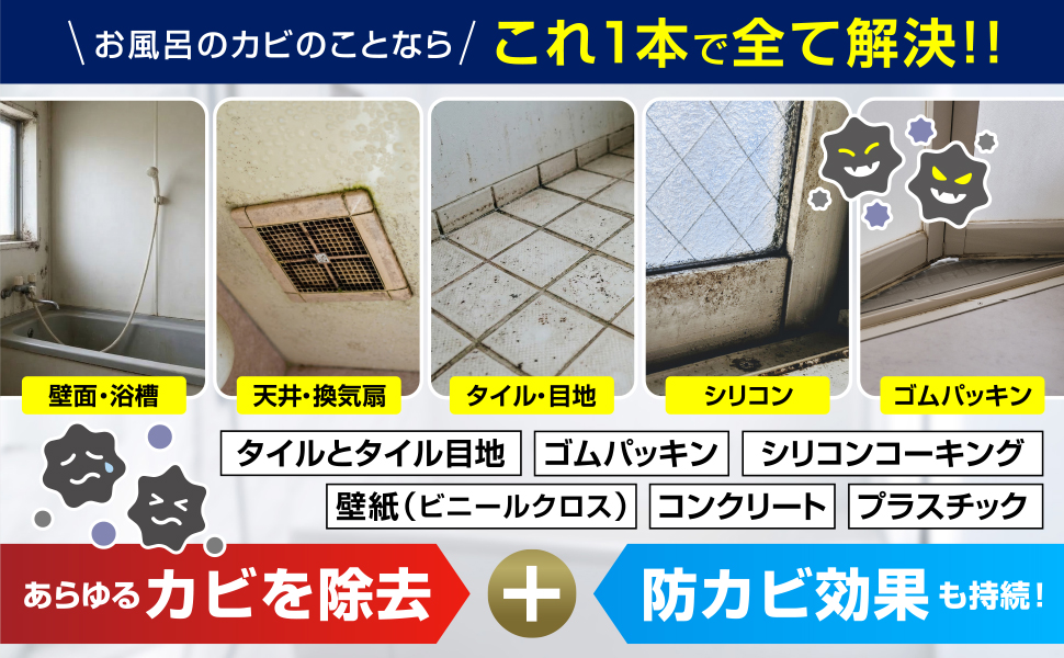 お風呂(タイル目地やユニットバス、ゴムパッキンなど)、プラスチックなどのカビ取り剤です。