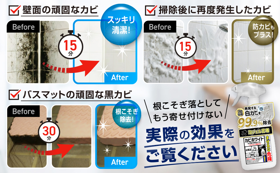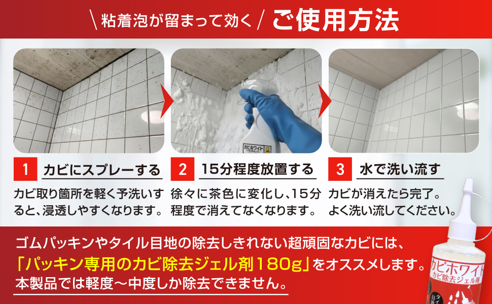 <使用方法>カビにスプレーして15分放置(ひどいカビは30分放置)。カビが消えたら十分に洗い流して下さい。洗い流せない箇所は水拭きをして下さい。