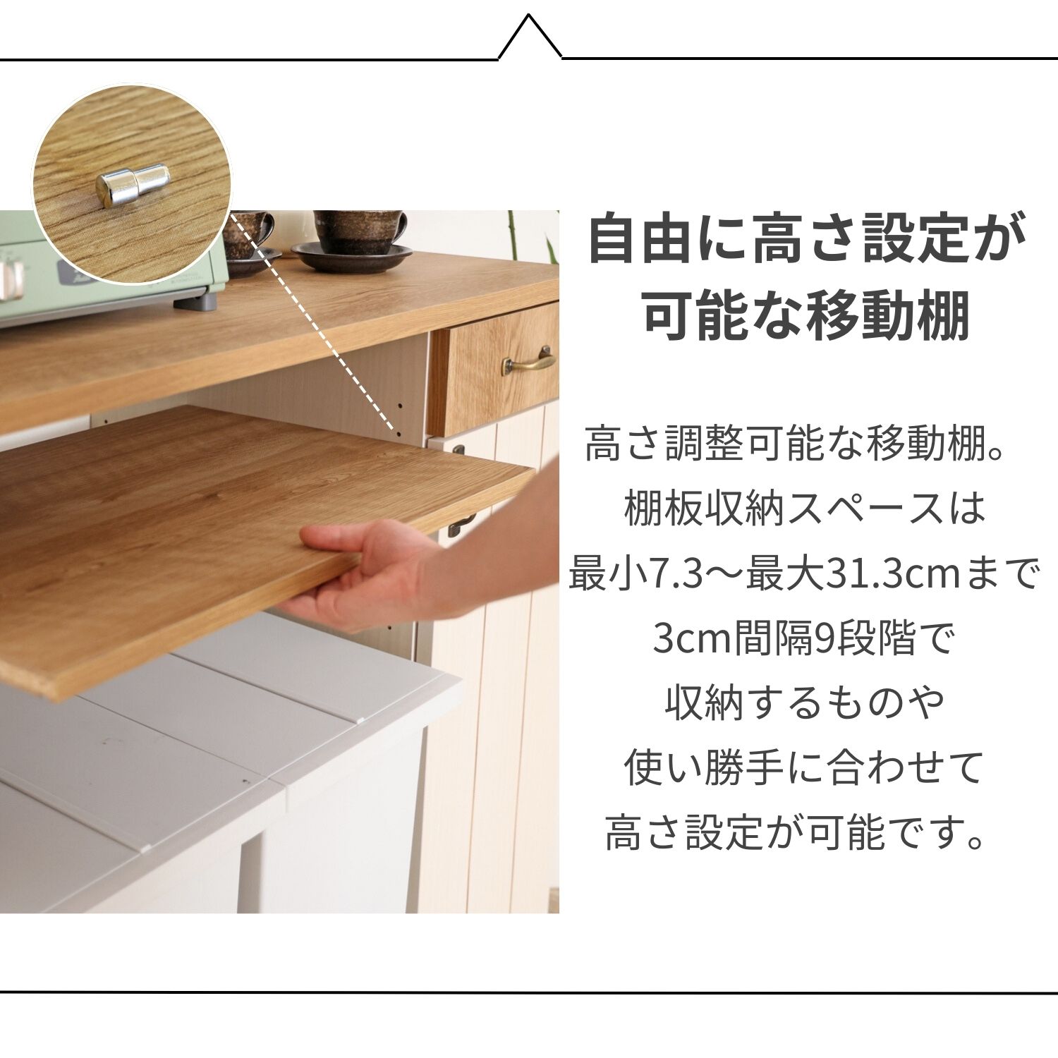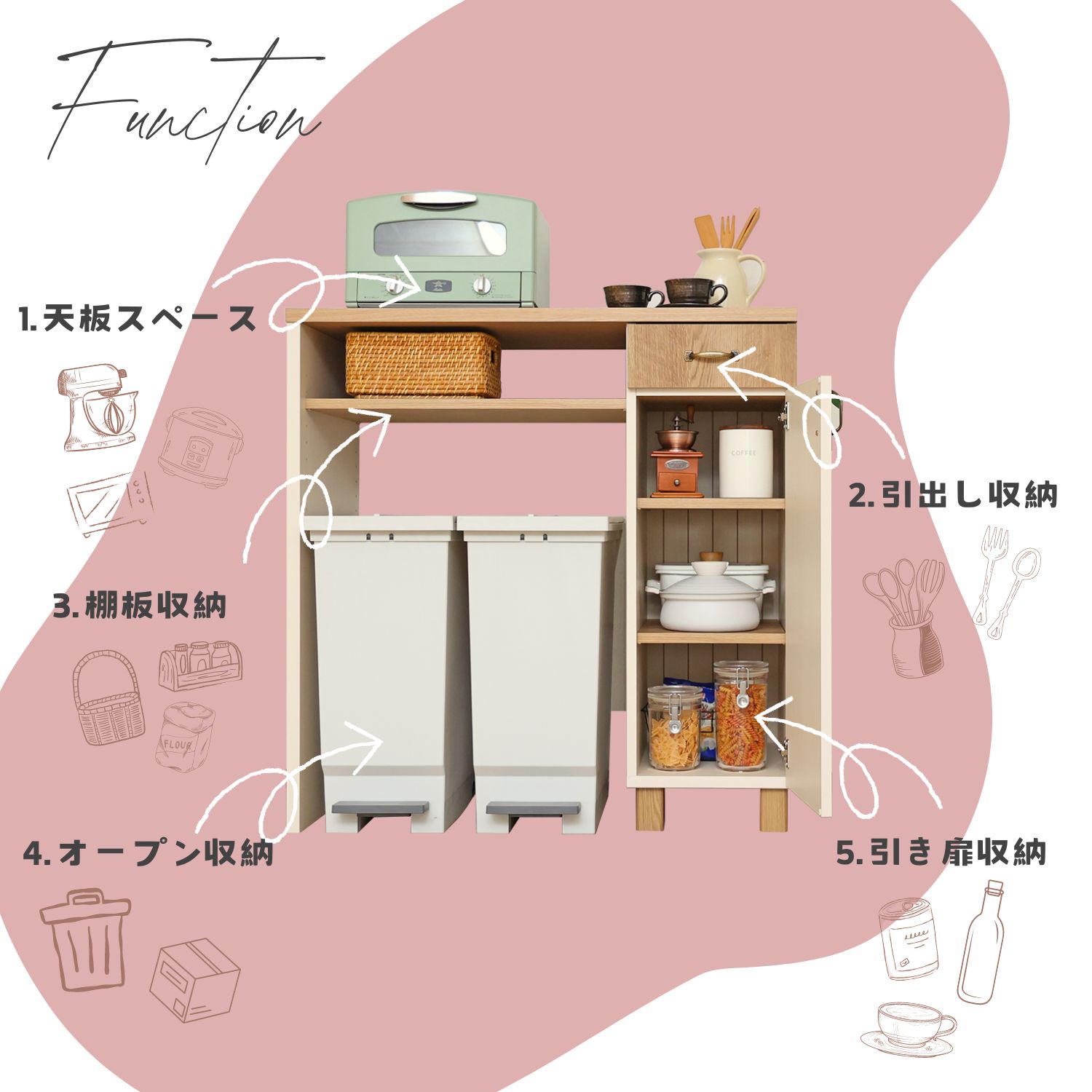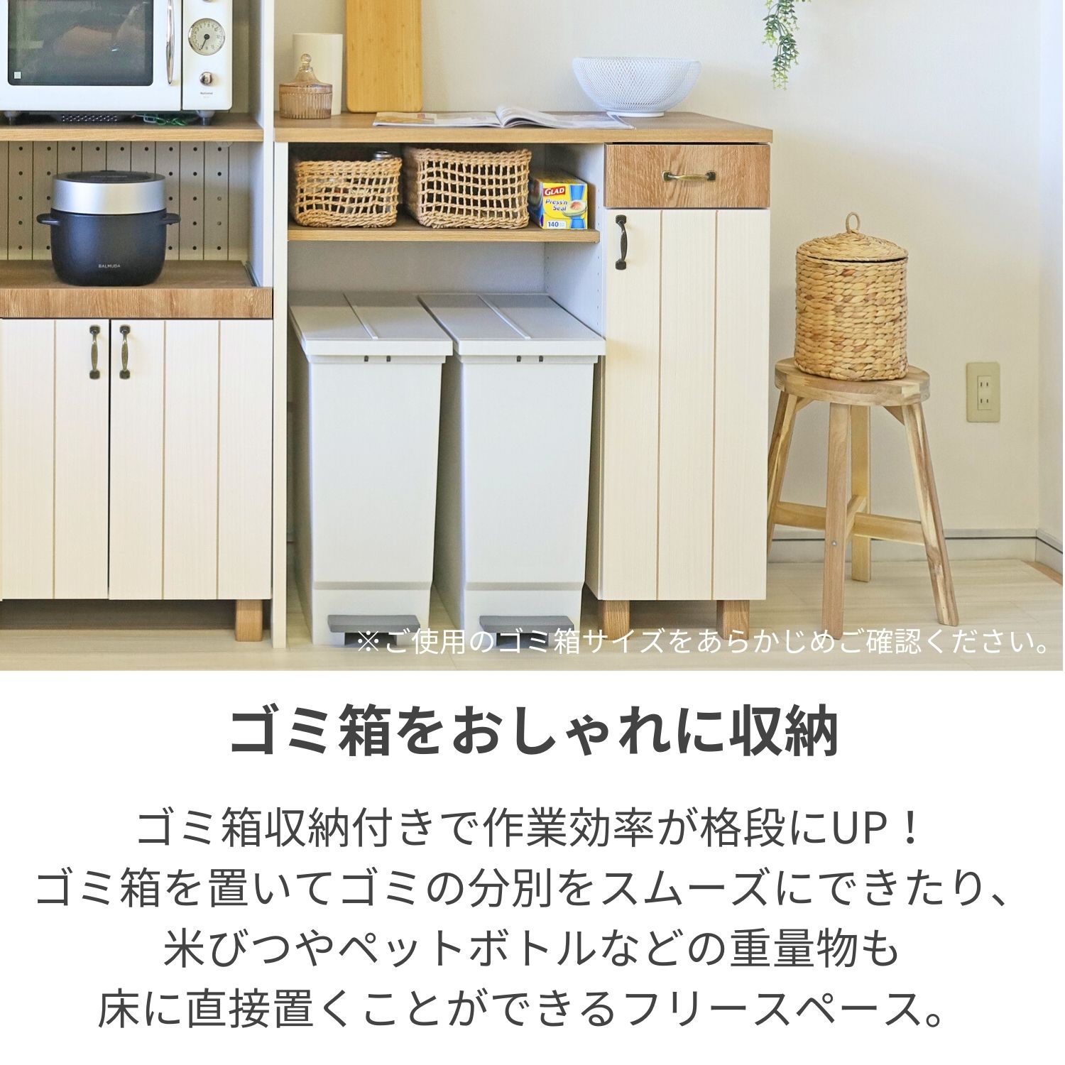 ※フレンチカントリー風のデザインが魅力!幅約90cm・高さ約92cmの扉付きレンジ台でゴミ箱上収納も叶えるキッチン収納。