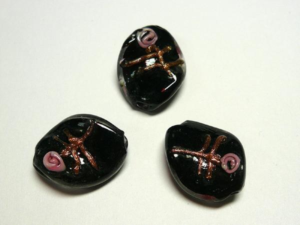 ■トンボ玉連■リーフ 花模様 約20×15mm約14粒 黒 06-0661