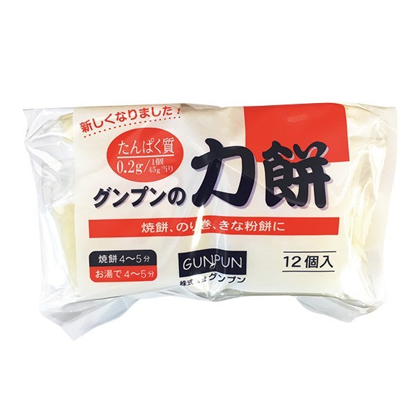 グンプンが独自製法で開発した1枚あたりのたんぱく質0.2g(1個当り)のでんぷん餅です。