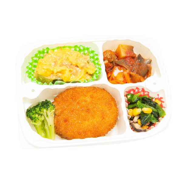 | 原材料 | カニクリームコロッケ【野菜パン粉(国産)、小麦粉、かに、濃縮乳、たまねぎ、ラード、でん粉、カニ風味かまぼこ、ゼラチン、バター、砂糖、コーンフラワー、食塩、チキンエキス調味料、かにエキス調味料】、厚揚げ、玉葱、さつま芋、蓮根、トマトピューレー、スクランブルエッグ、ほうれん草、揚げ茄子、しめじ、ブロッコリー、えのき、エリンギ、コーン、マヨネーズ、調合油、ケチャップ、にんにく、葱、オイスターソース、オリーブ油、チキンコンソメ、濃口醤油、食塩、胡椒/調味料(アミノ酸等)、香辛料、増粘剤(加工でん粉、増粘多糖類)、酸味料、安定剤(メチルセルロース、ヒドロキシプロピルメチルセルロース)、着色料(カラメル、パプリカ粉末、紅麹、カロチノイド色素)、乳化剤、香料、凝固剤(Mg)、ピロリン酸Na、クエン酸、pH調整剤、シリコーン(原材料の一部に、乳成分、卵、小麦、大豆、えび、かに、鶏肉、ゼラチンを含む。) |