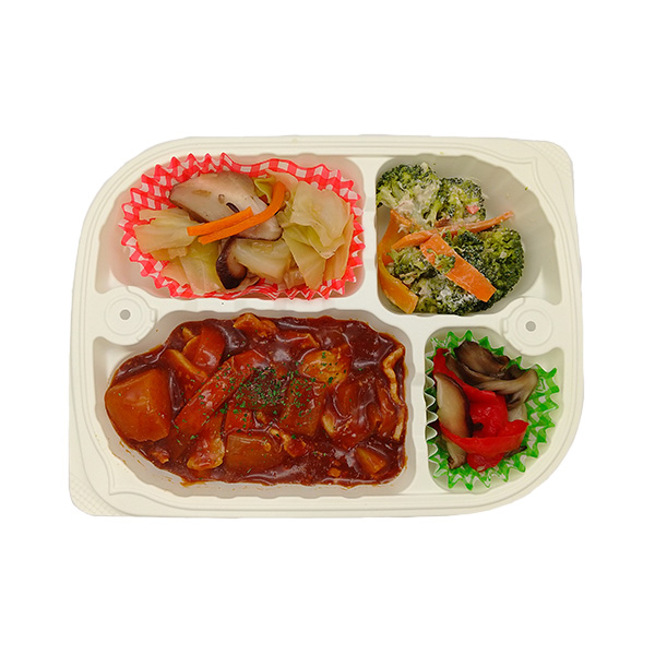 | 原材料 | 牛肉(アメリカ産)、キャベツ、ブロッコリー、玉葱、赤ワイン、じゃが芋、デミグラスソース、タルタルソース、トマトピューレ、人参、椎茸、しめじ、舞茸、赤ピーマン、えのき、マッシュルーム、めんつゆ、胡麻油、無塩バター、ウスターソース、ケチャップ、チキンコンソメ、にんにく、調合油、食塩、胡椒/調味料(アミノ酸等)、香料、香辛料、増粘剤(加工でん粉、キサンタンガム)、着色料(カラメル)、pH調整剤、酸味料(原材料の一部に、牛肉、鶏肉、豚肉、乳成分、りんご、大豆、小麦、ごま、卵を含む) |
