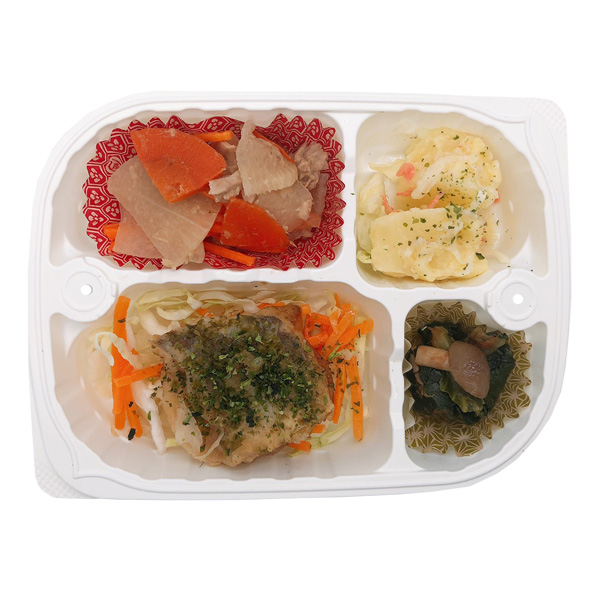 | 原材料 | たら(外国産)、じゃが芋、青梗菜、大根、調合油、マヨネーズ、しめじ、葱、人参、キャベツ、片栗粉、白滝、かに風味かまぼこ、ツナフレーク、濃口醤油、みりん、合成酒、めんつゆ、上白糖、胡麻油、だしの素、青のり、かつお節、食塩、胡椒/調味料(アミノ酸等)、増粘剤(加工でん粉、増粘多糖類)、炭酸Ca、香辛料、着色料(紅麹、クチナシ、ラック、アナトー)、酸味料、シリコーン(原材料の一部に、小麦、大豆、卵、かに、ごまを含む。) |